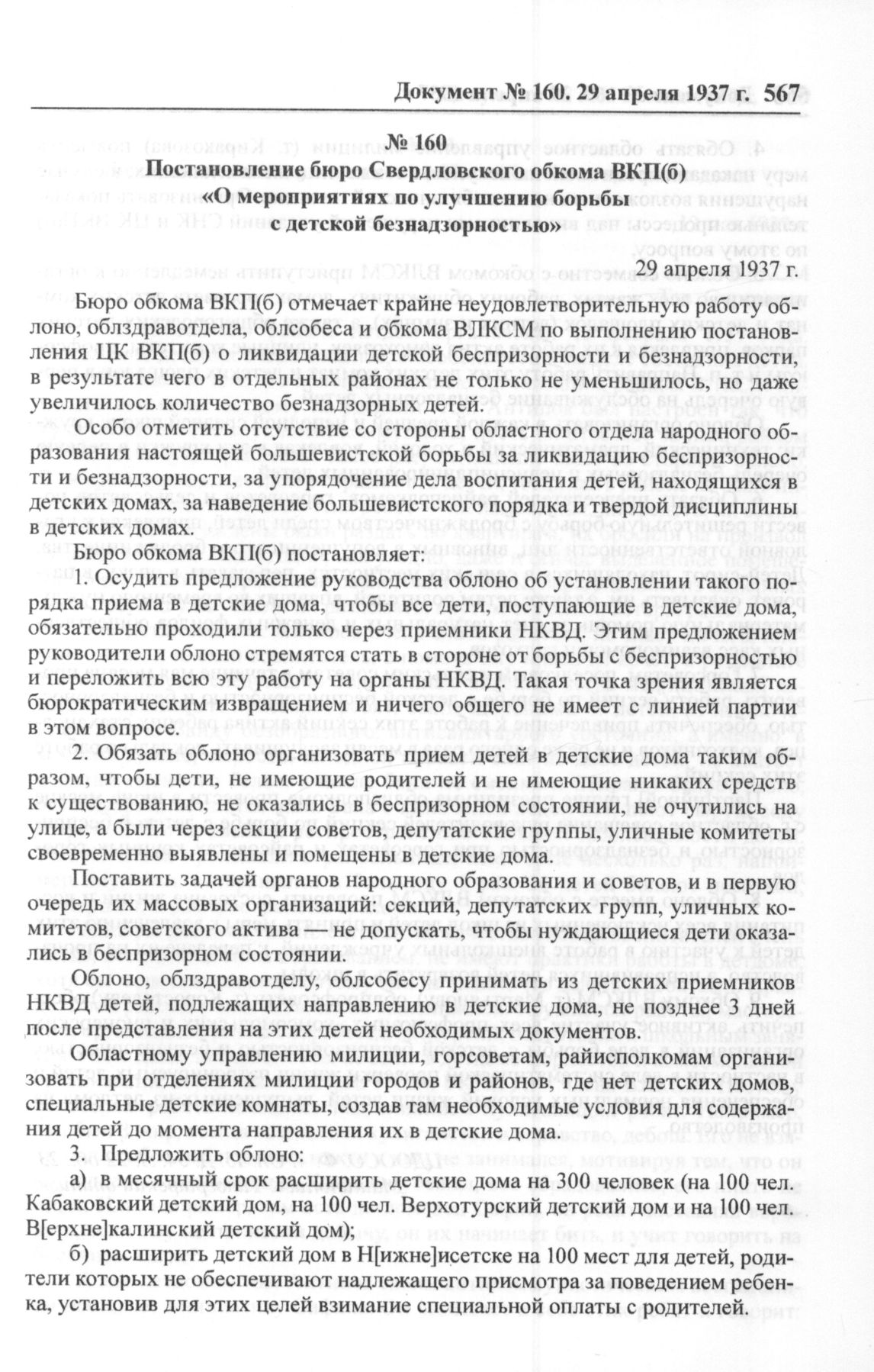 Постановление бюро Свердловского обкома ВКПб) «О мероприятиях по улучшению борьбы с детской безнадзорностью». 29 апреля 1937 г.