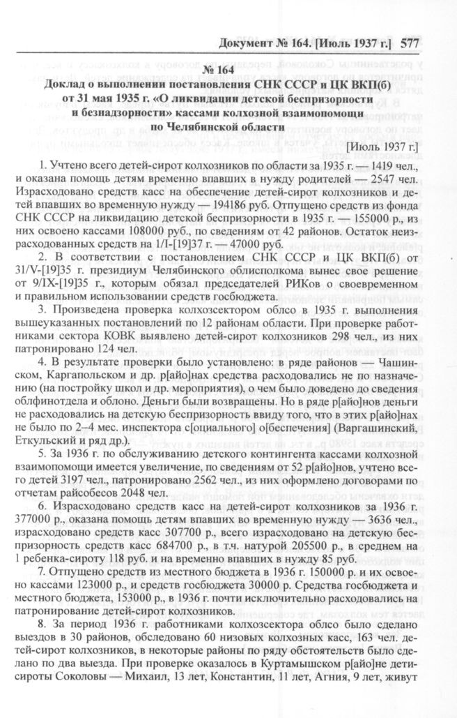 Доклад о выполнении постановления СНК СССР и ЦК ВКП(б) от 31 мая 1935 г. «О ликвидации детской беспризорности и безнадзорности» кассами колхозной взаимопомощи по Челябинской области. [Июль 1937 г.] // ГАРФ. Ф. P-5207. Oп. 1. Д. 1618. Л. 4, 4 об. Машинопись. Копия.