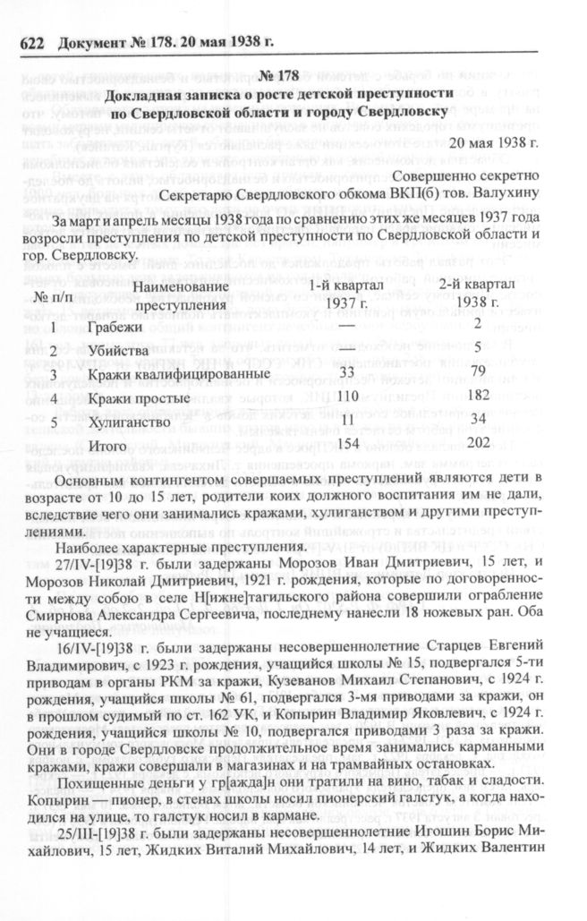Докладная записка о росте детской преступности по Свердловской области и городу Свердловску. 20 мая 1938 г. // ЦДООСО. Ф. 4. Oп. 31. Д. 41. Л. 34-37. Машинопись. Подлинник.