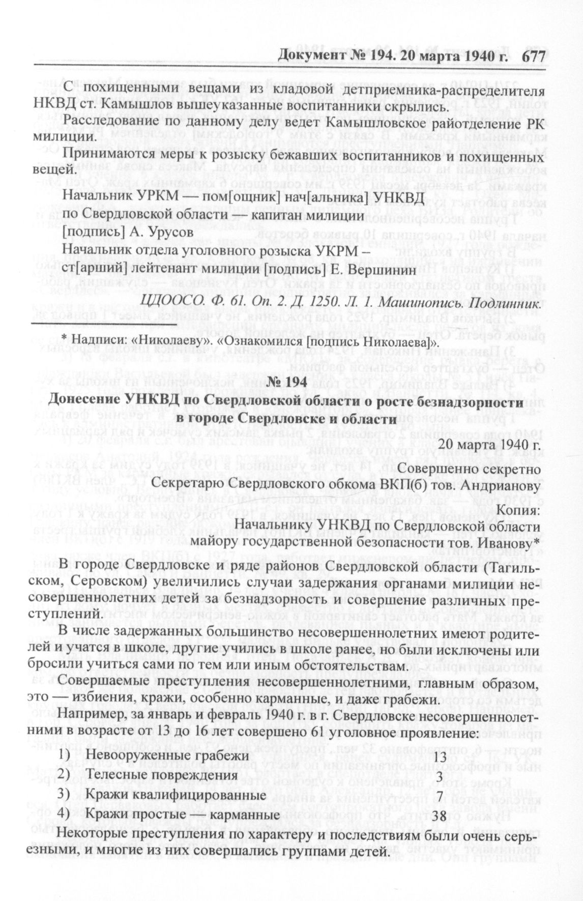 Донесение УНКВД по Свердловской области о росте безнадзорности в городе Свердловске и области. 20 марта 1940 г. // ЦДООСО. Ф. 61. Oп. 2. Д. 1250. Л. 31-37. Машинопись. Подлинник.