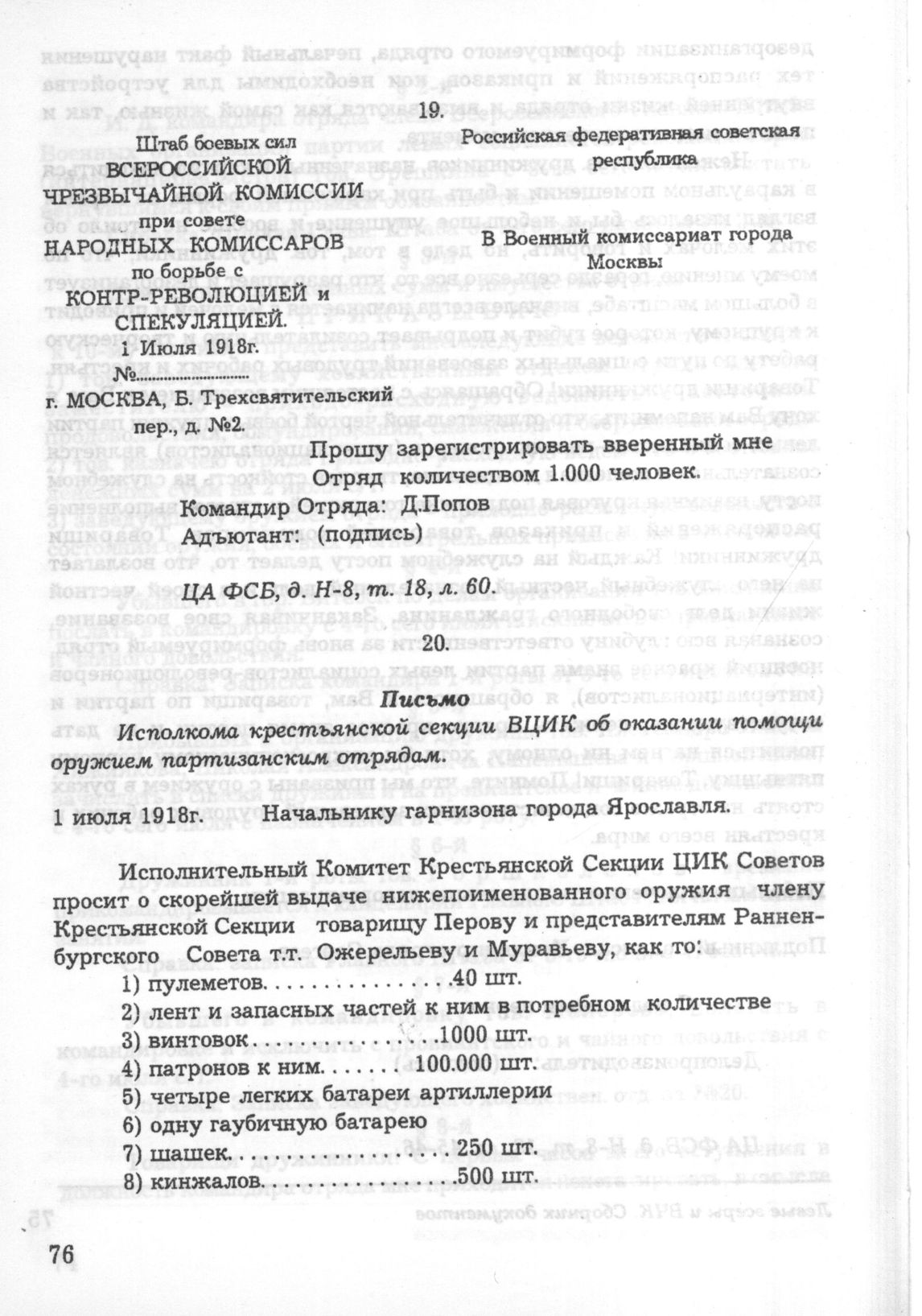 Рапорт Д. Попова в Военный комиссариат города Москвы. 1 июля 1918 г. // ЦА ФСБ, д. Н-8, т. 18, л. 60.