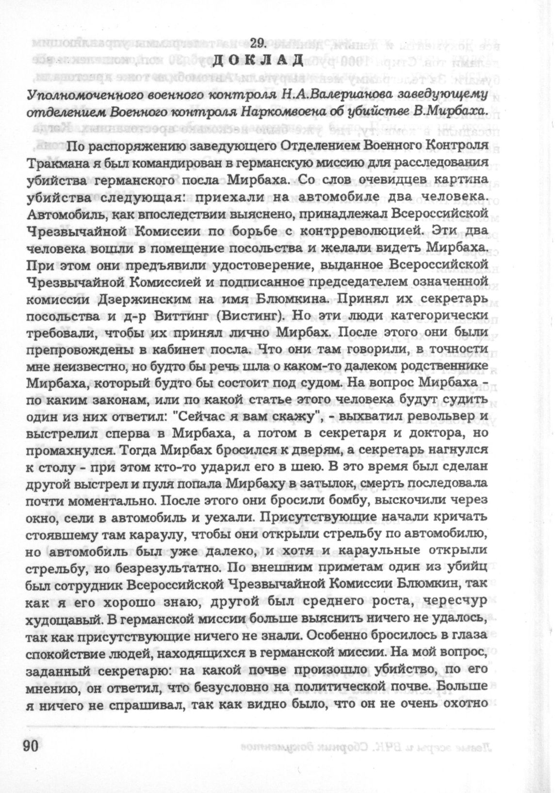 Доклад Уполномоченного военного контроля Н.А. Валерианова заведующему отделением Военного контроля Наркомвоена об убийстве В. Мирбаха. 8 июля 1918 г. // ЦА ФСБ, ф. 1, oп. 2, д. 2, л. 1-5.