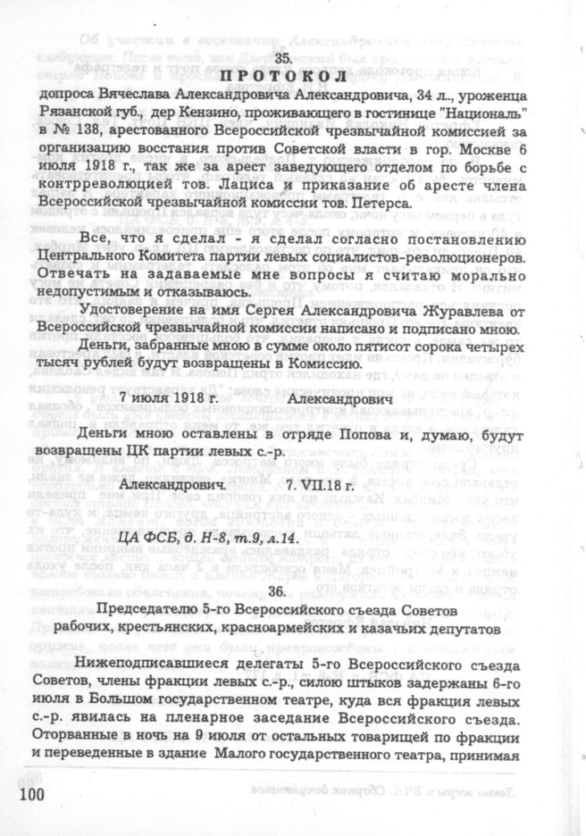 Письмо делегатов - членов фракции левых с.-p. Председателю 5-го Всероссийского съезда Советов рабочих, крестьянских, красноармейских и казачьих депутатов. 9 июля 1918 г. // ЦА ФСБ, д. Н-8, т. 2, л. 60-61.