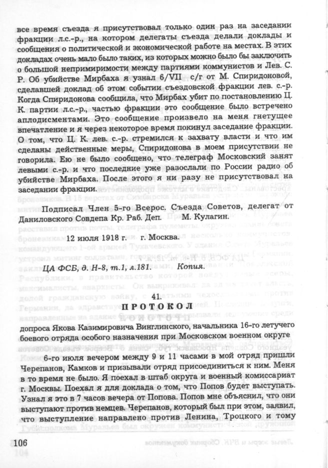 Протокол допроса Якова Казимировича Винглинского, начальника 16-го летучего боевого отряда особого назначения при Московском военном округе. 13 июля 1918 г. // ЦА ФСБ, д. Н-8, т. 1, л. 208.