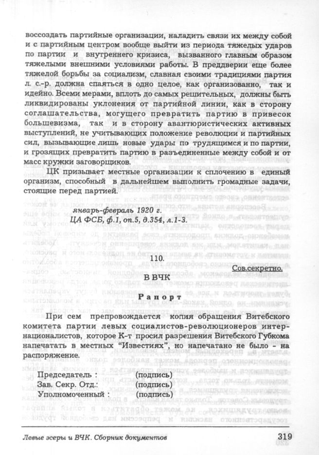 Сопроводительная записка к обращению и обращение Витебского комитета партии левых социалистов-революционеров интернационалистов. 17 января 1921 г. // ЦА ФСБ, а. Н-685, т. 6, л. 27-29.