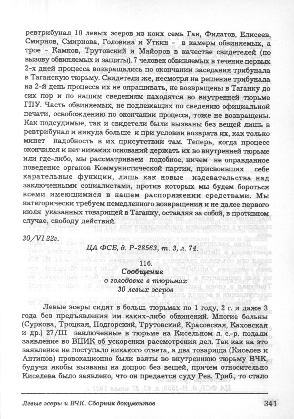 Сообщение о голодовке в тюрьмах 30 левых эсеров. 1922 г.