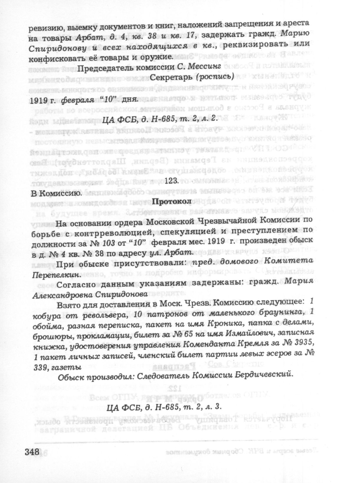Протокол обыска в квартире Спиридоновой М.А. 10 февраля 1919 г. // ЦА ФСБ, д. Н-685, т. 2, л. 3.