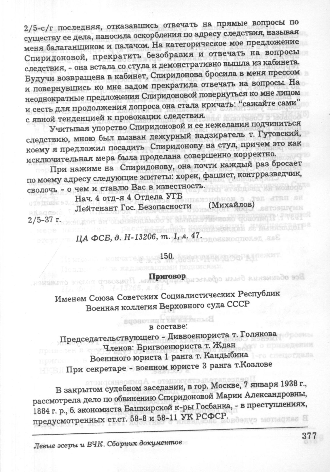 Приговор Военной коллегии Верховного суда СССР М.А. Спиридоновой. М...