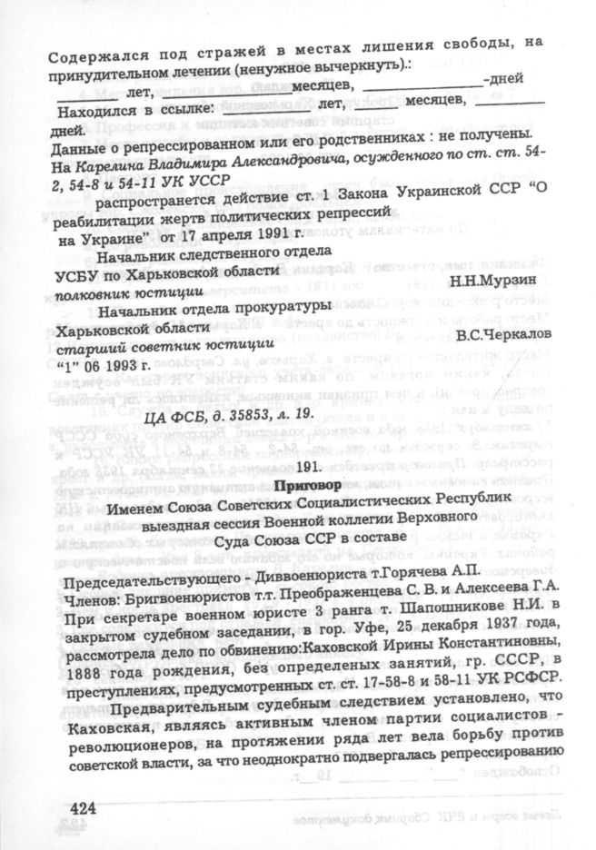 Приговор Военной коллегии Верховного Суда Союза ССР Каховской Ирине Константиновне. 25 декабря 1937 г.
