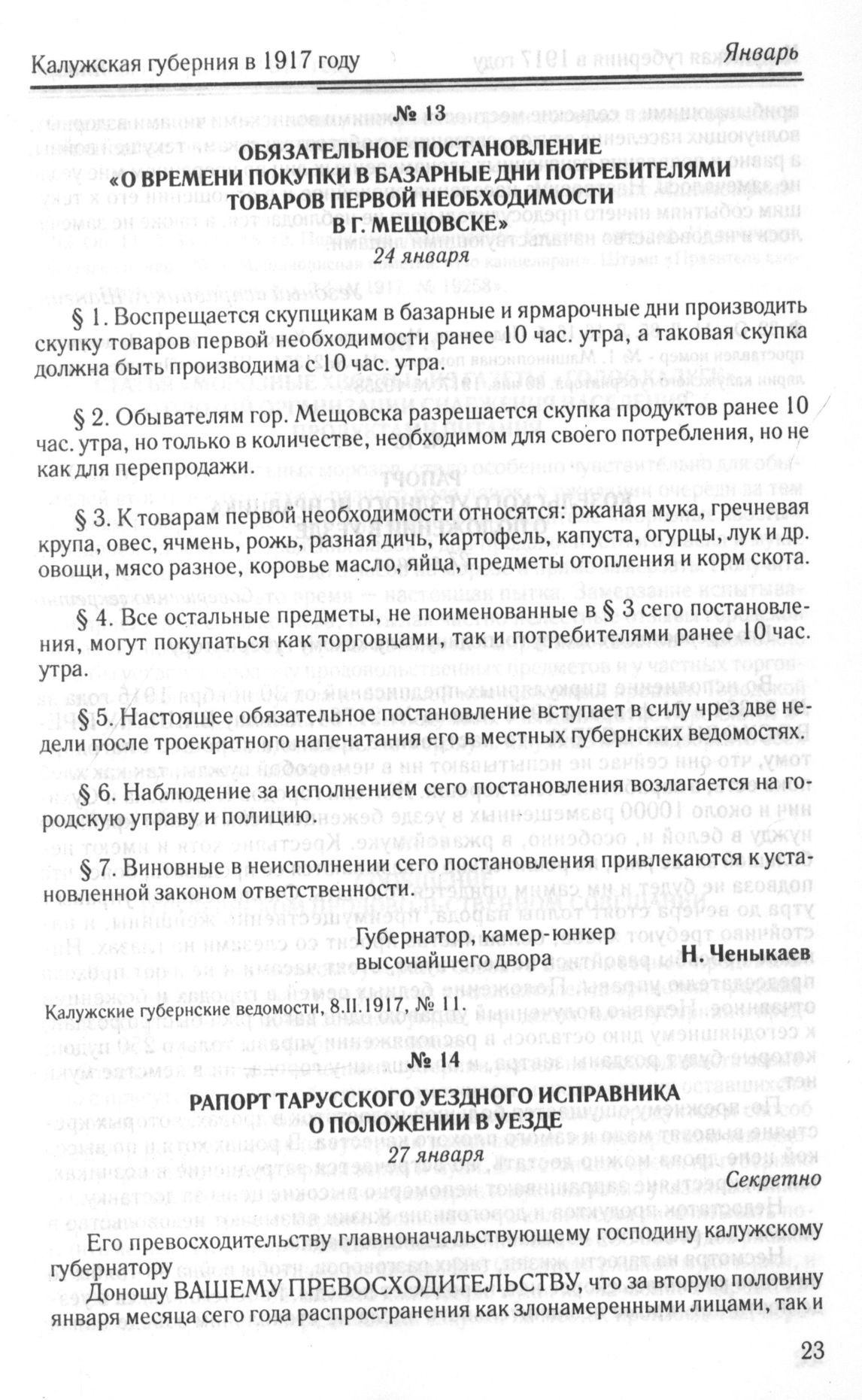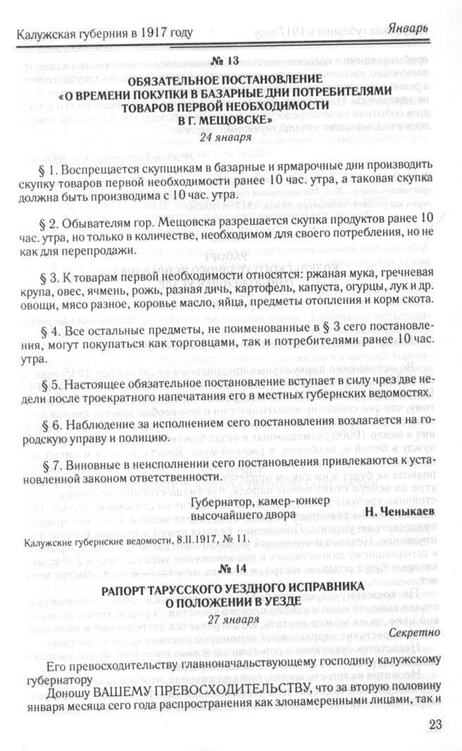 Обязательное постановление «О времени покупки в базарные дни потребителями товаров первой необходимости в г. Мещовске». 24 января // Калужские губернские ведомости, 8. II.1917, № 11.