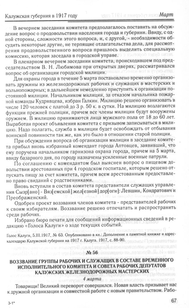 Воззвание группы рабочих и служащих в составе Временного исполнительного комитета и Совета рабочих депутатов Калужских железнодорожных мастерских. 4 марта // Голос Калуги, 6.III.1917, № 64. Опубликовано в кн.: Дополнение к памятной книжке и адрес-календарю Калужской губернии на 1917 г. Калуга. 1917, с. 93.