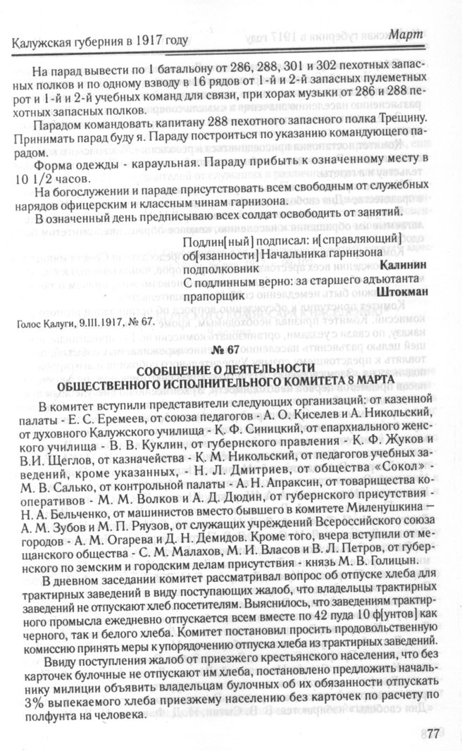 Сообщение о деятельности Общественного исполнительного комитета. 8 марта // Голос Калуги, 9.III.1917, № 67. Опубликовано в кн.: Дополнение к памятной книжке и адрес-календарю Калужской губернии на 1917 г. Калуга. 1917, с. 99-102.