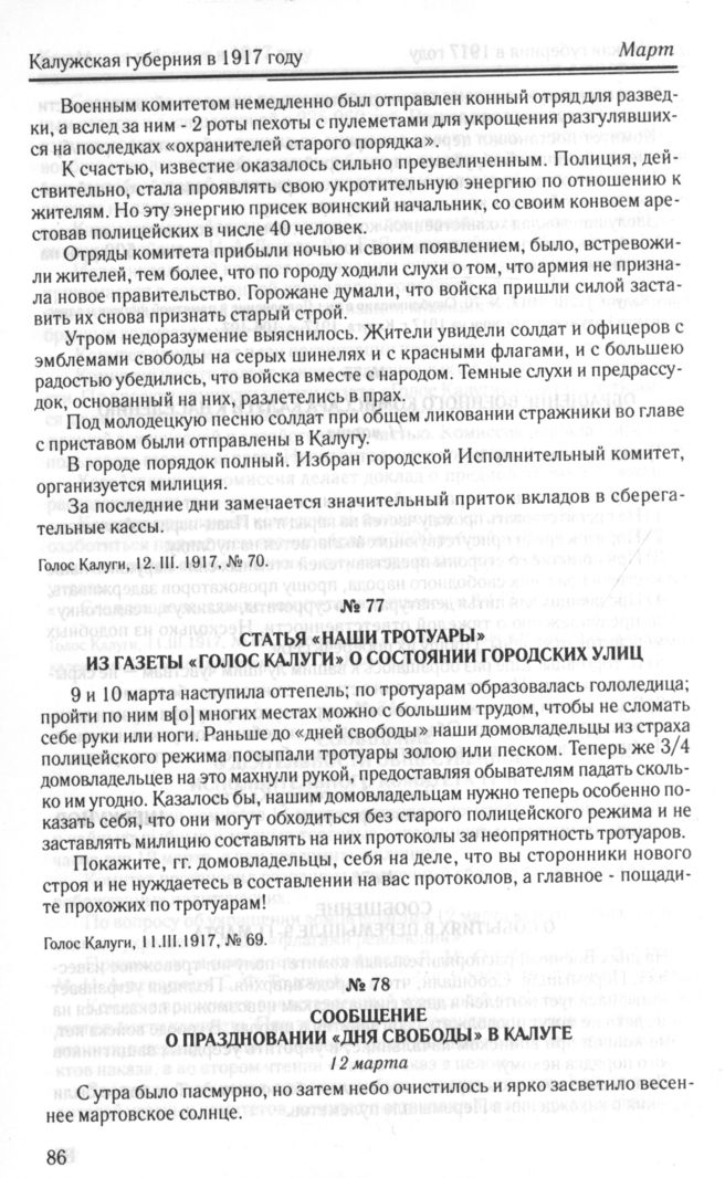 Сообщение о праздновании «Дня свободы» в Калуге. 12 марта // Голос Калуги, 13.III.1917, № 71. Опубликовано в кн.: Дополнение к памятной книжке и адрес-календарю Калужской губернии на 1917 г. Калуга. 1917, с. 108-109.