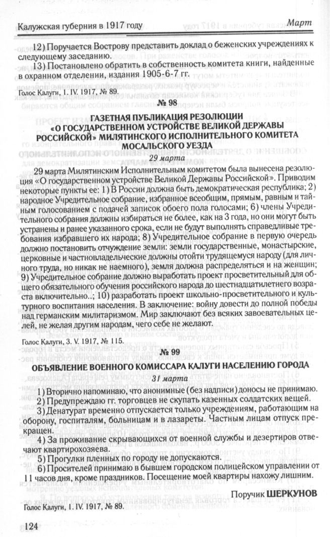Газетная публикация резолюции «О государственном устройстве Великой державы Российской» Милятинского исполнительного комитета Мосальского уезда. 29 марта // Голос Калуги, 3.V.1917, № 115.
