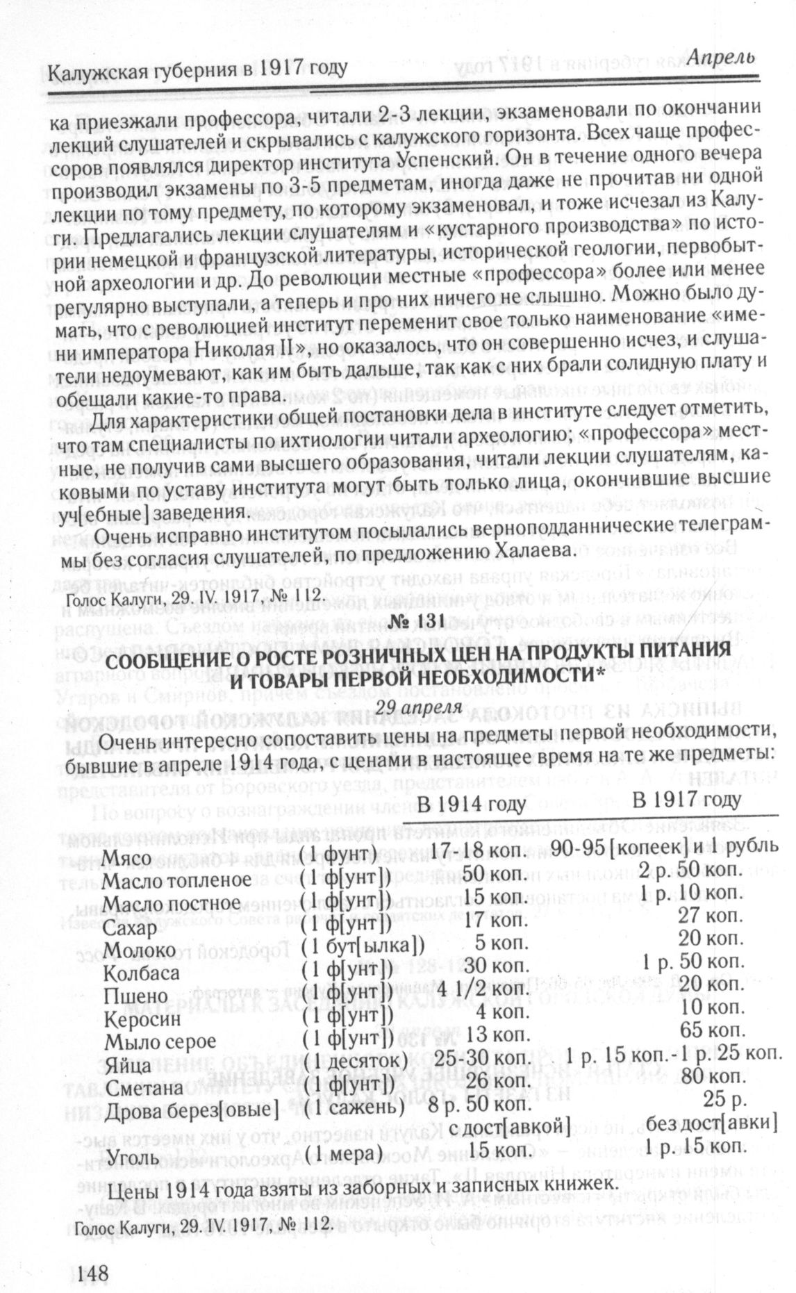 Сообщение о росте розничных цен на продукты питания и товары первой необходимости. 29 апреля // Голос Калуги, 29.IV.1917, № 112.