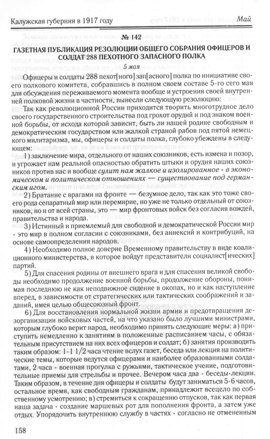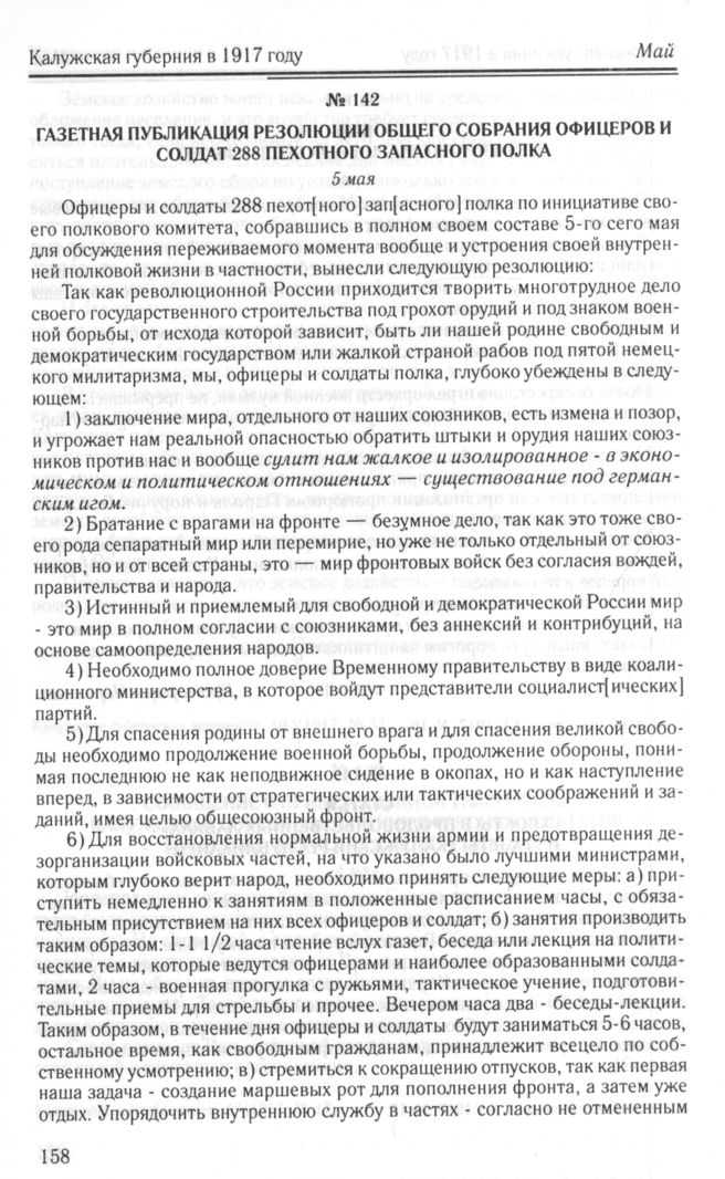 Газетная публикация резолюции Общего собрания офицеров и солдат 288 Пехотного запасного полка. 5 мая // Известия Калужского Совета рабочих и солдатских депутатов, 18.V.1917, № 2.