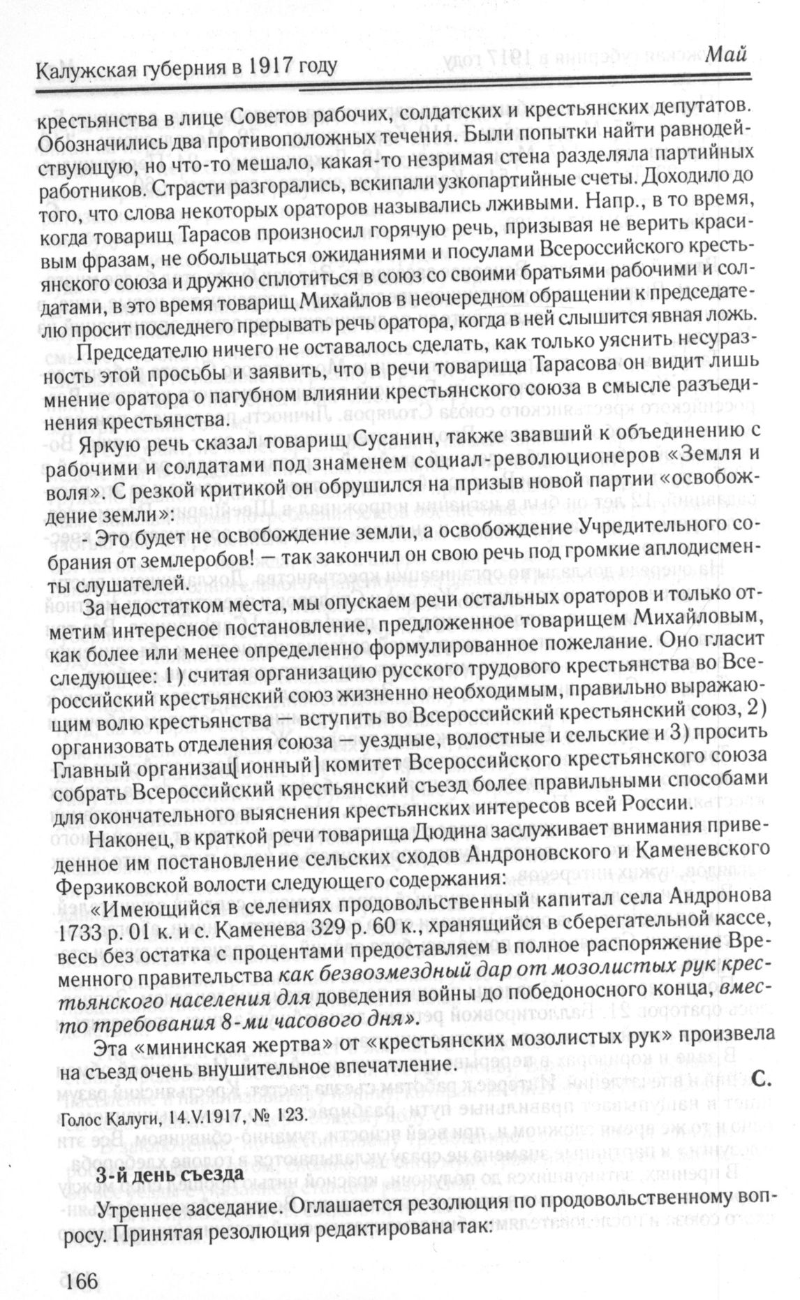 Газетный отчет о работе Губернского крестьянского съезда. 9-11 мая. Третий день // Голос Калуги, 16.V.1917, № 124.