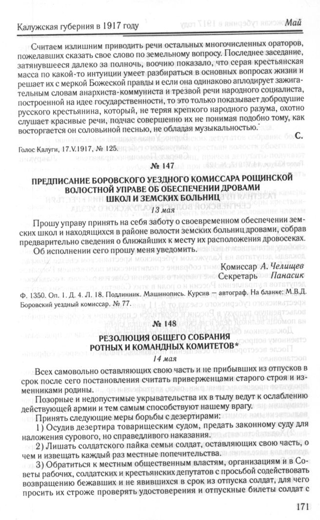 Резолюция Общего собрания ротных и командных комитетов. 14 мая // Голос Калуги, 14.V.1917, № 123.