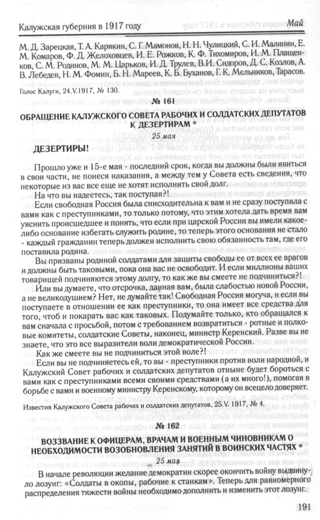 Обращение Калужского Совета рабочих и солдатских депутатов к дезертирам. 25 мая // Известия Калужского Совета рабочих и солдатских депутатов, 25.V.1917, № 4.