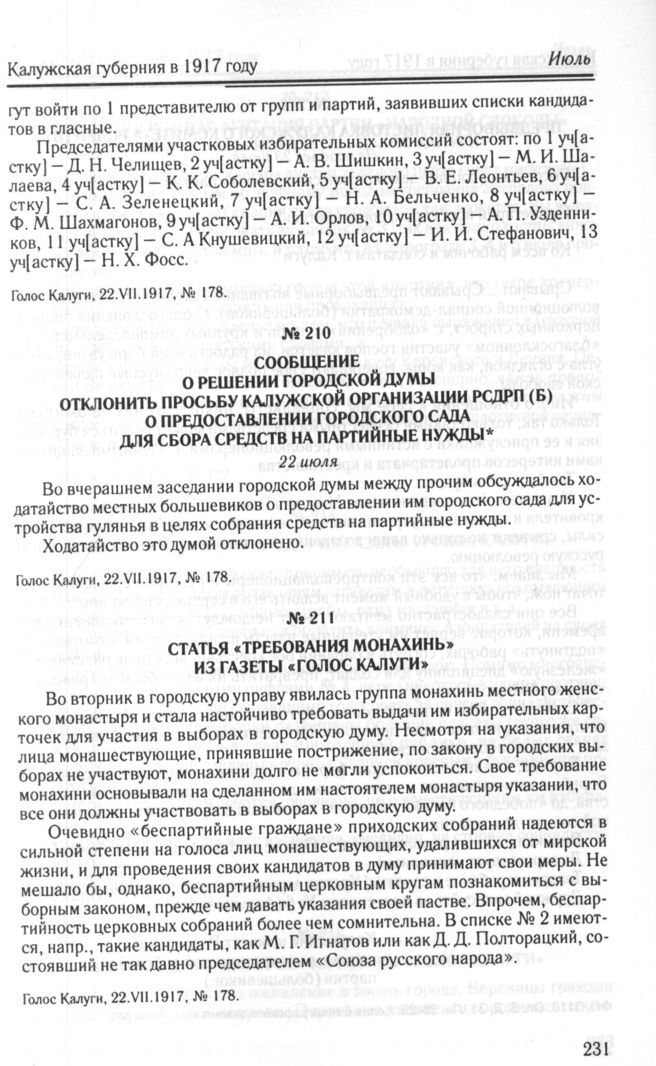 Сообщение о решении Городской думы отклонить просьбу Калужской организации РСДРП(б) о предоставлении городского сада для сбора средств на партийные нужды.22 июля // Голос Калуги, 22.VII.1917, № 178.
