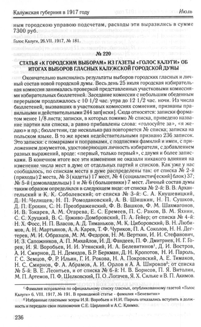 Статья «К городским выборам» из газеты «Голос Калуги» об итогах выборов гласных Калужской городской думы // Голос Калуги, 27.VII.1917, № 182.