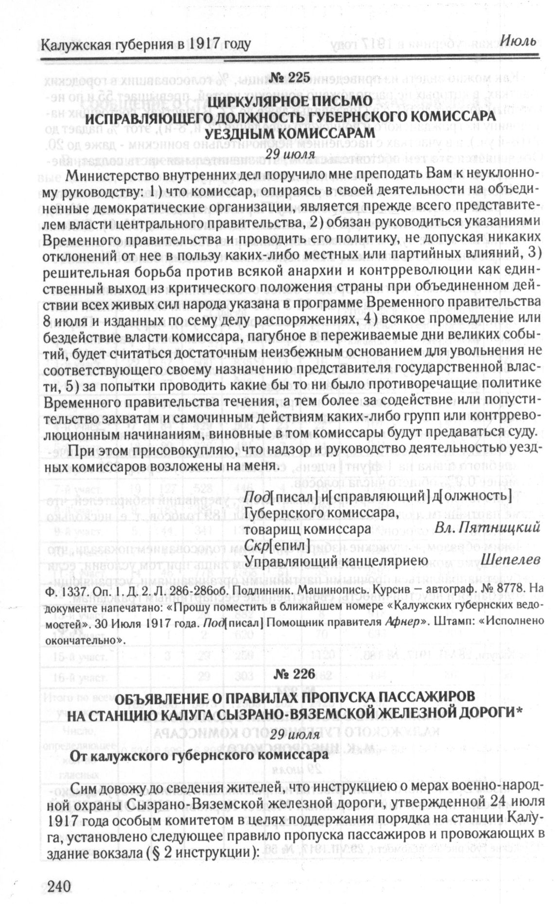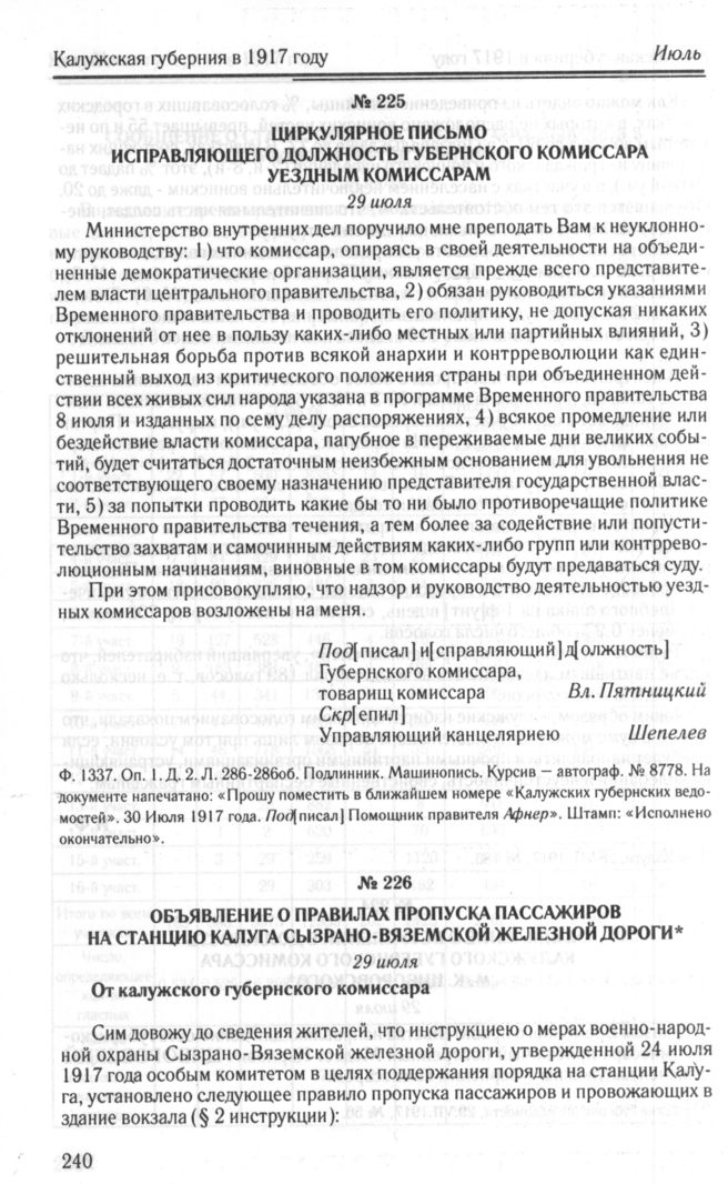 Объявление о правилах пропуска пассажиров на станцию Калуга Сызрано-Вяземской железной дороги. 29 июля // Голос Калуги, 29.VII.1917, № 184.