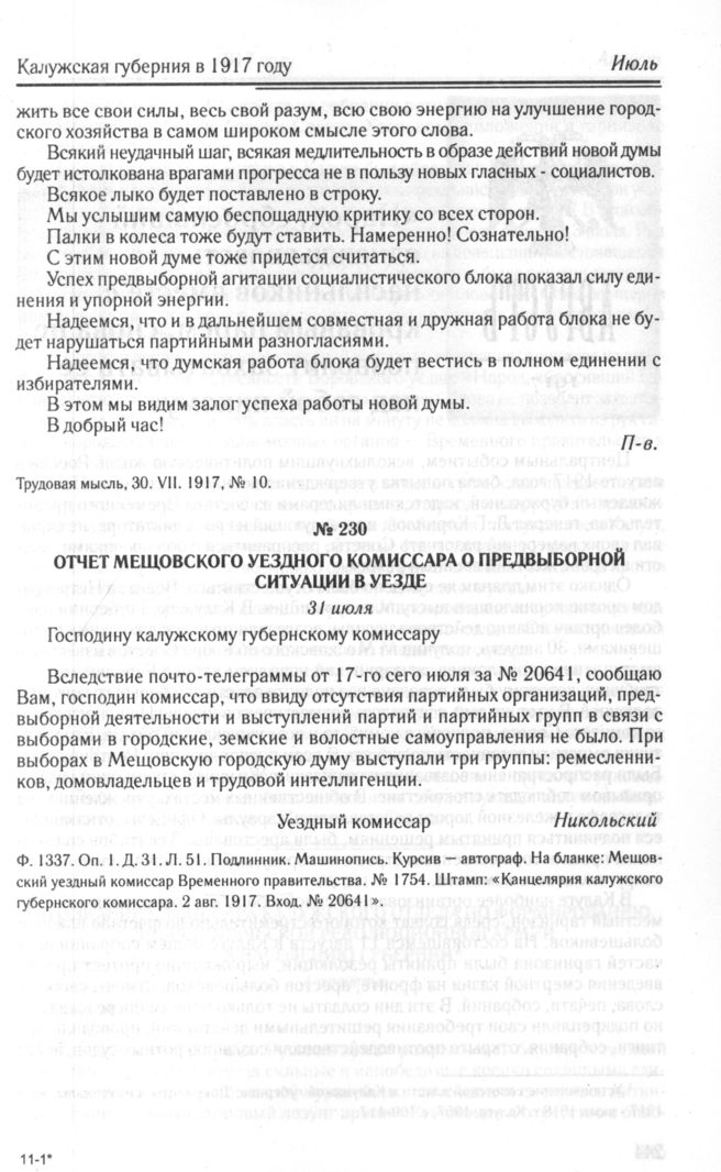 Отчет Мещовского уездного комиссара о предвыборной ситуации в уезде. 31 июля // ГАКО. Ф. 1337. Oп. 1. Д. 31. Л. 51. Подлинник. Машинопись. Курсив - автограф.