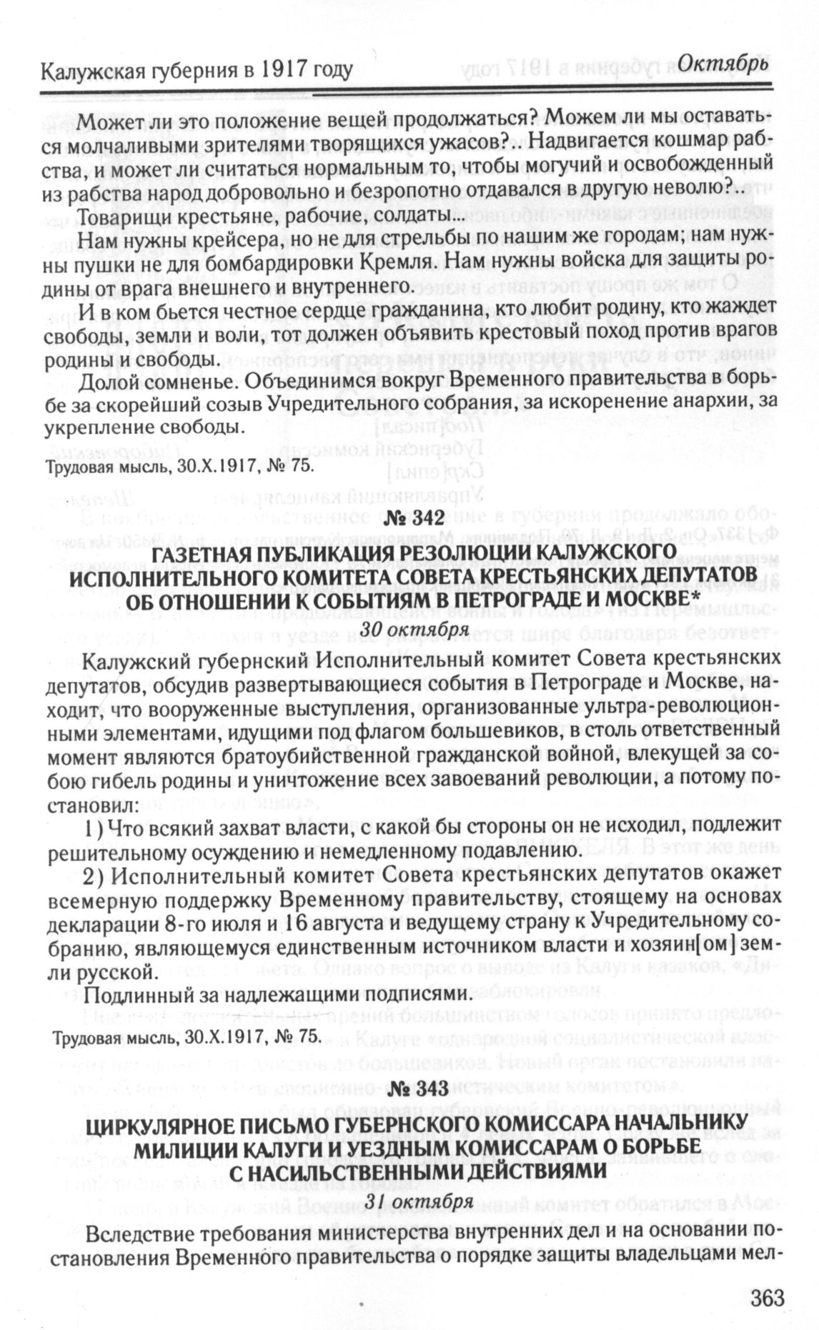 Газетная публикация резолюции Калужского Исполнительного Комитета Совета крестьянских депутатов об отношении к событиям в Петрограде и Москве. 30 октября // Трудовая мысль, 30.X.1917, № 75.