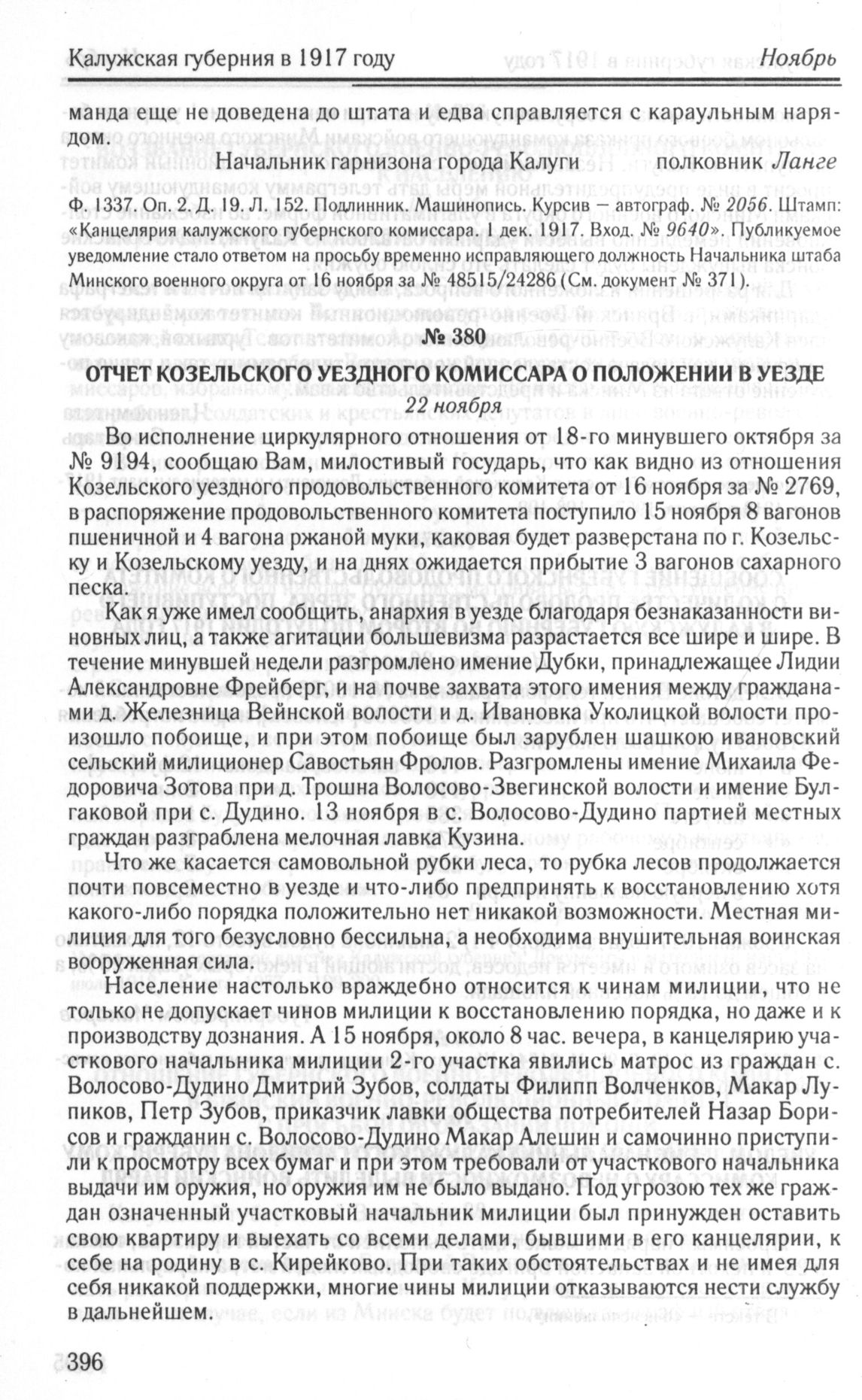 Отчет Козельского уездного комиссара о положении в уезде. 22 ноября