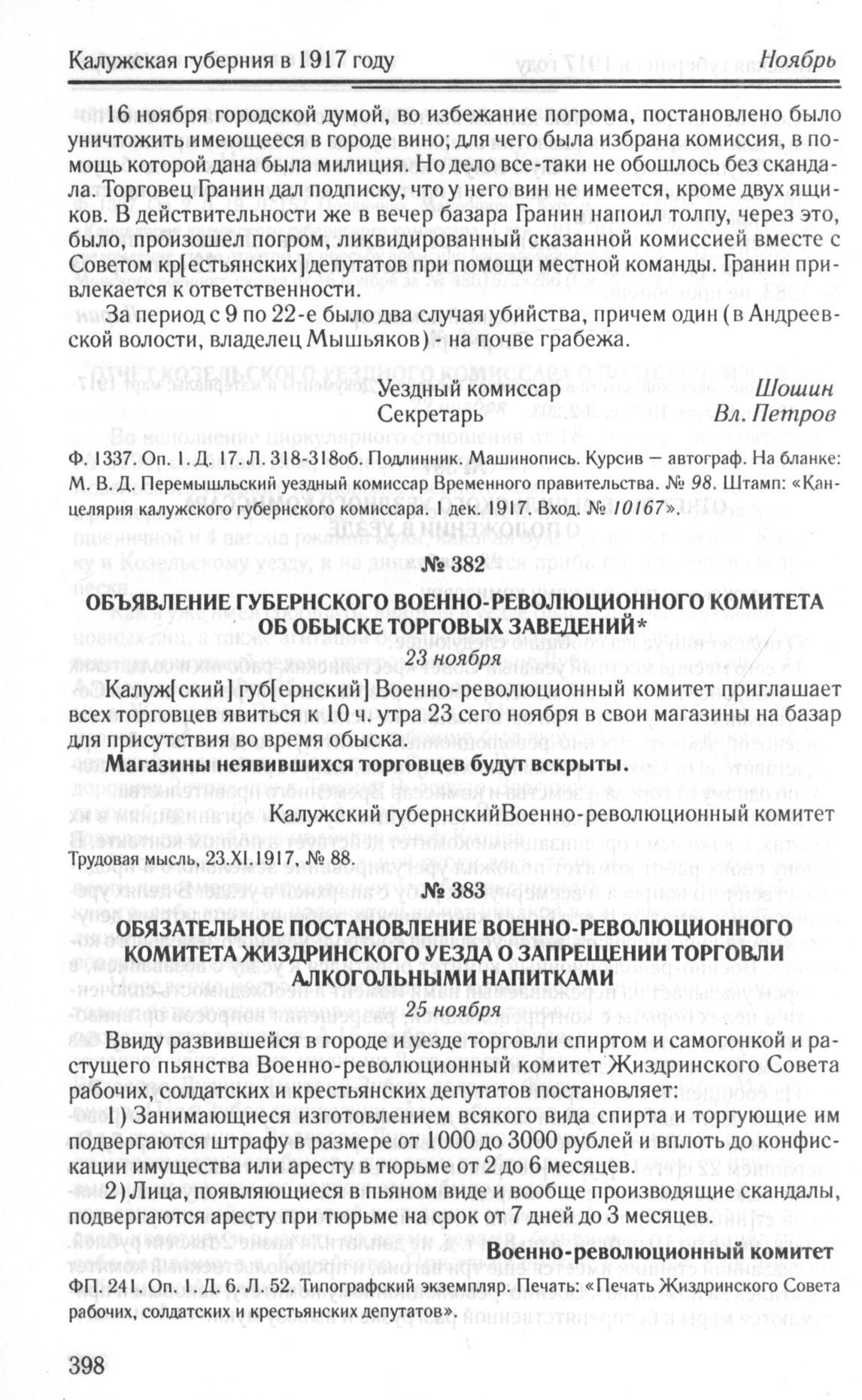 Обязательное постановление Военно-революционного Комитета Жиздринского уезда о запрещении торговли алкогольными напитками. 25 ноября // ГАКО. ФП. 241. Oп. 1. Д. 6. Л. 52. Типографский экземпляр.