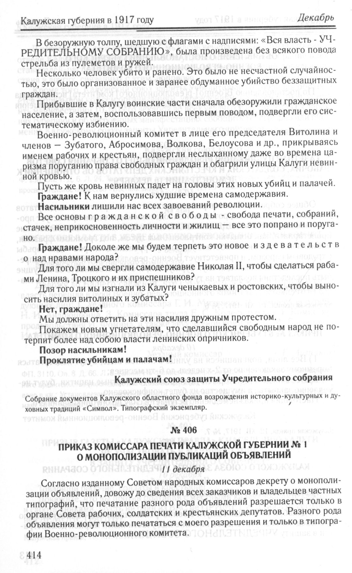 Приказ Комиссара печати Калужской губернии № 1 о монополизации публикаций объявлений. 11 декабря // Калужская правда, 12.XII.1917, № 7.
