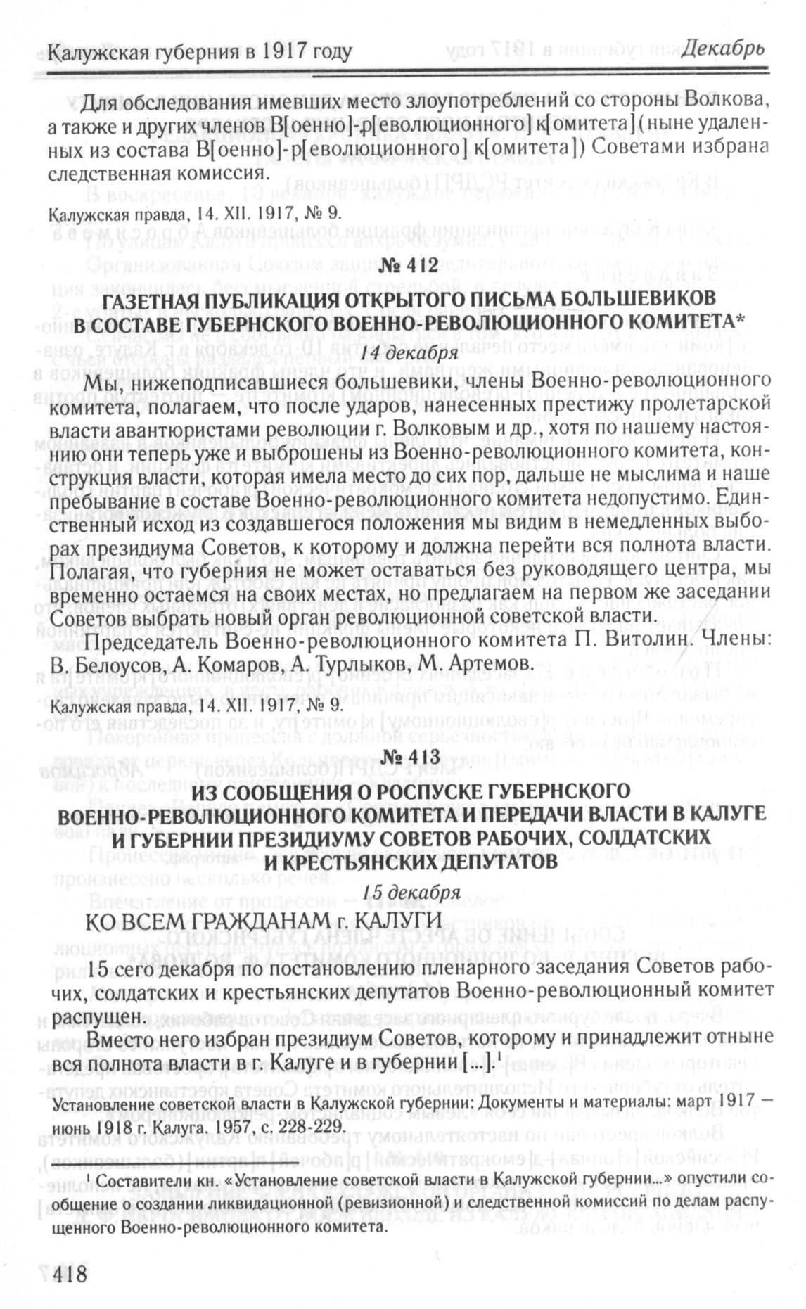 Из сообщения о роспуске губернского Военно-революционного Комитета и передачи власти в Калуге и губернии Президиуму Советов рабочих, солдатских и крестьянских депутатов. 15 декабря // Установление советской власти в Калужской губернии: Документы и материалы: март 1917- июнь 1918 г. Калуга. 1957, с. 228-229.