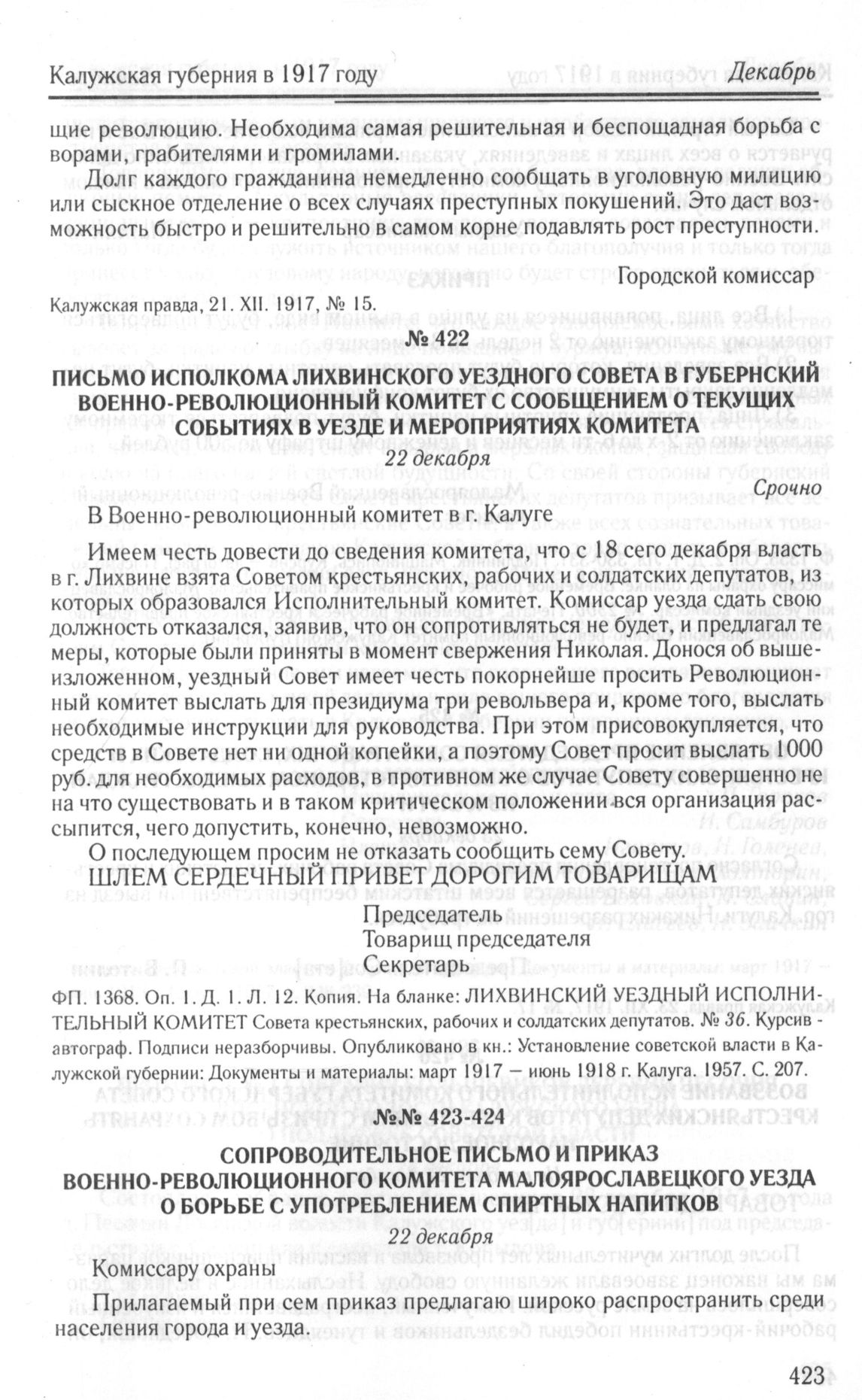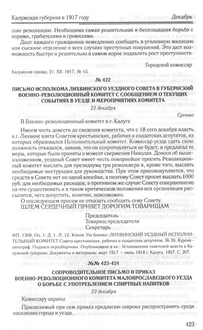 Письмо Исполкома Лихвинского уездного совета в губернский Военно-революционный Комитет с сообщением о текущих событиях в уезде и мероприятиях комитета. 22 декабря // ГАКО. ФП. 1368. Оп. 1. Д. 1. Л. 12. Копия. Опубликовано в кн.: Установление советской власти в Калужской губернии: Документы и материалы: март 1917 - июнь 1918 г. Калуга. 1957. С. 207.
