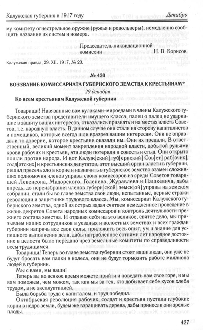 Воззвание Комиссариата губернского земства к крестьянам. 29 декабря // Калужская правда, 29. XII.1917, № 20.