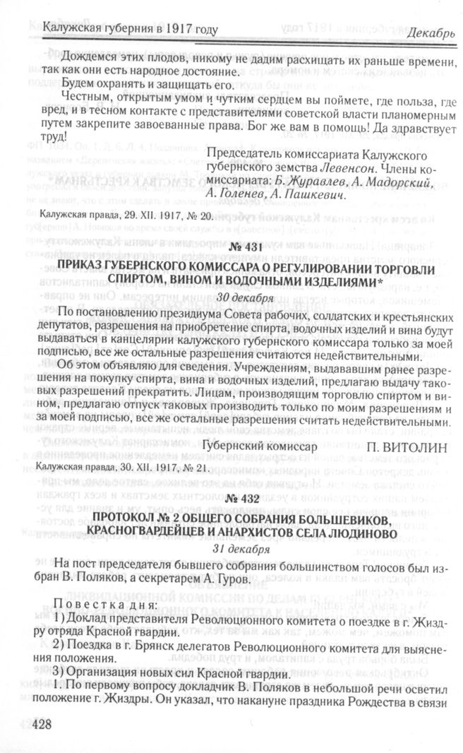 Приказ Губернского комиссара о регулировании торговли спиртом, вином и водочными изделиями. 30 декабря // Калужская правда, 30.XII.1917, № 21.