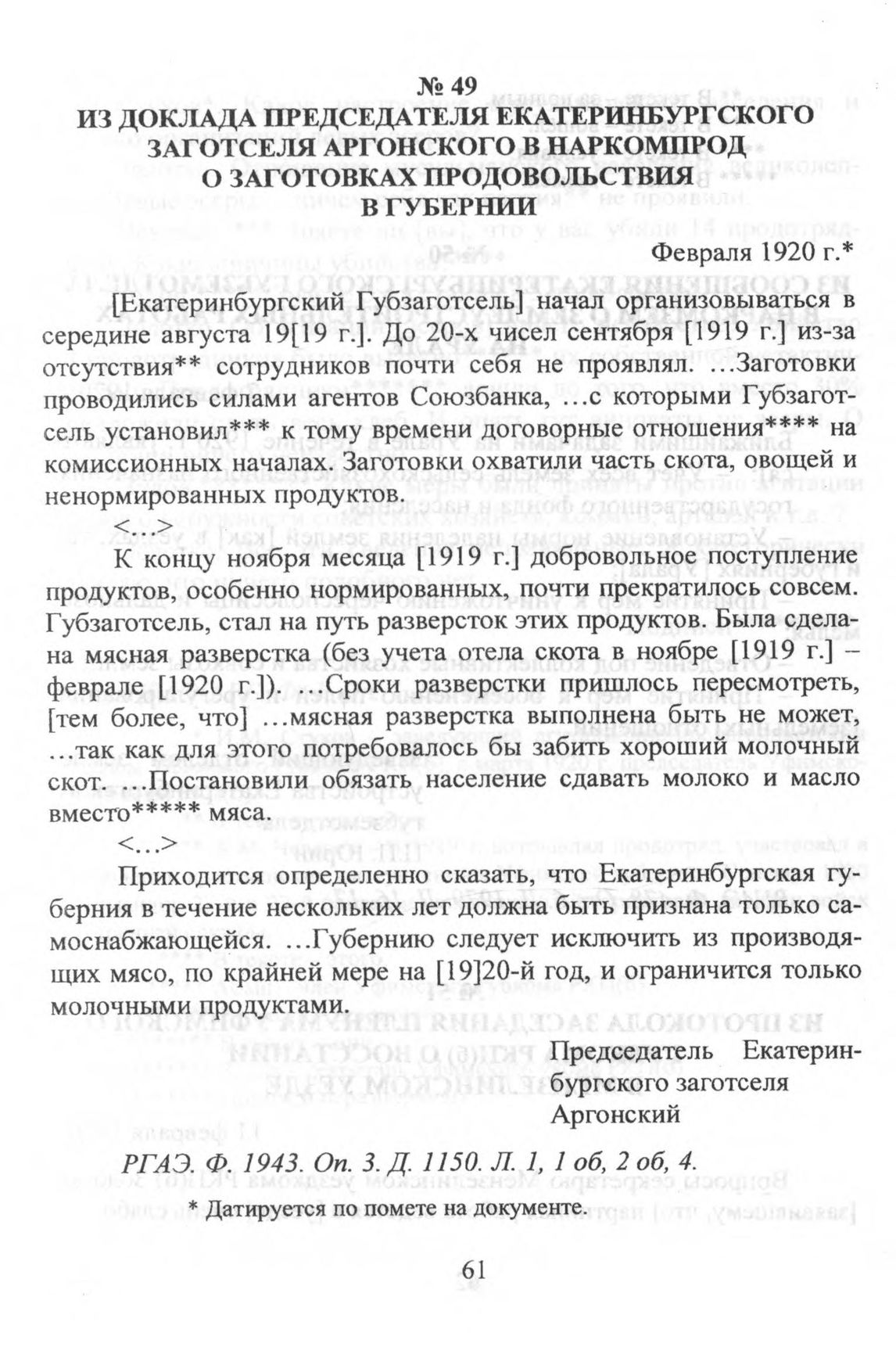 Из доклада председателя Екатеринбургского заготселя Аргонского в Наркомпрод о заготовках продовольствия в губернии. Февраля 1920 г. // РГАЭ. Ф. 1943. Oп. 3. Д. 1150. Л. 1, 1об, 2об, 4.