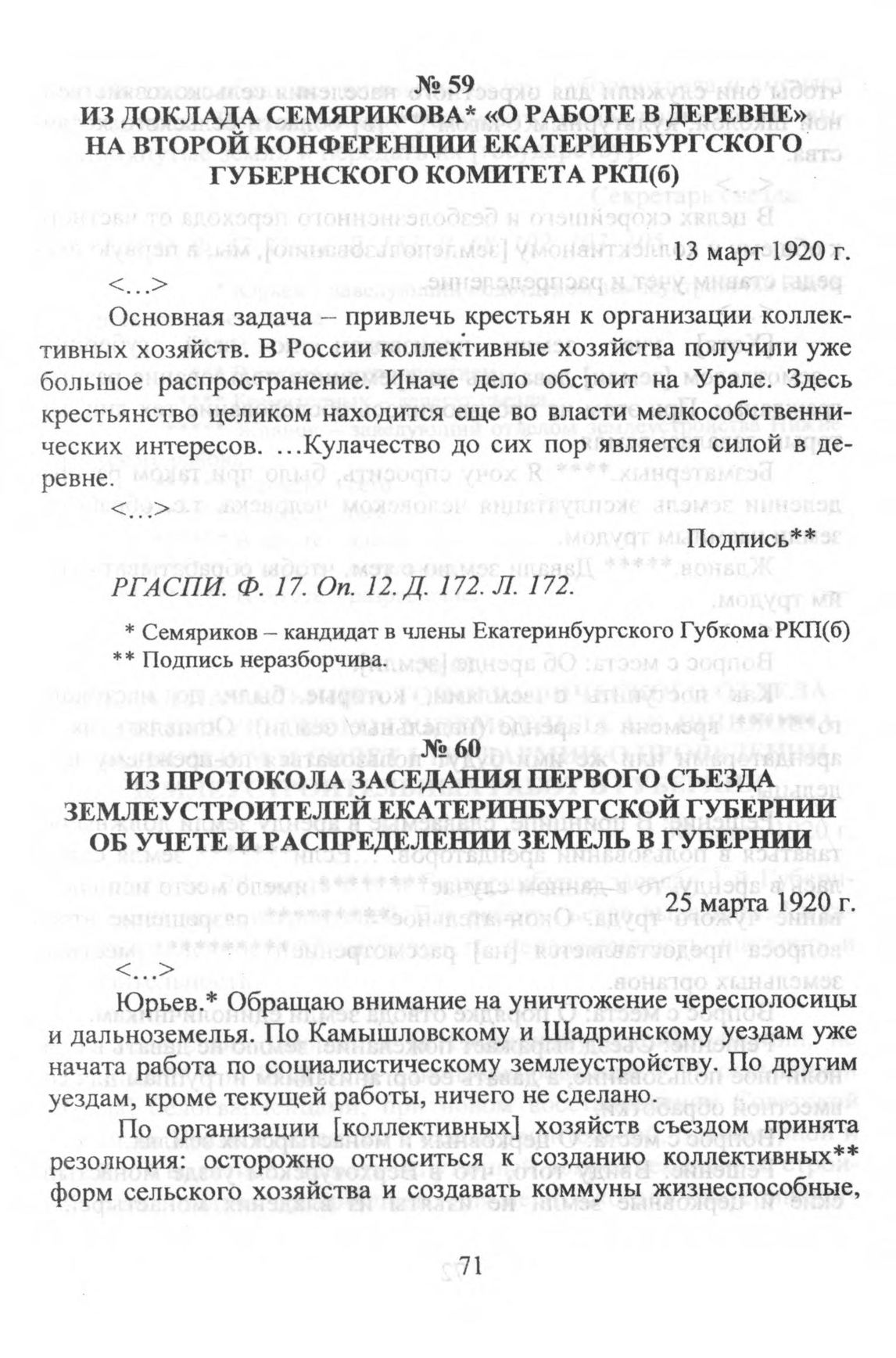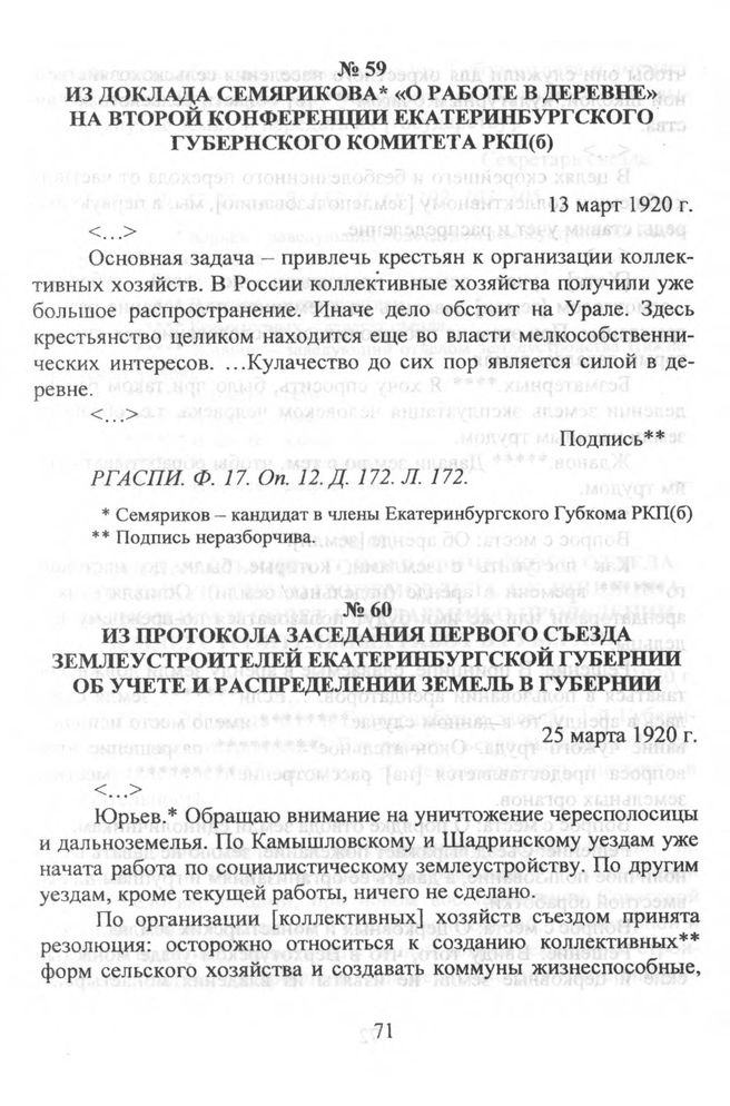 Из доклада Семярикова «О работе в деревне» на второй конференции Екатеринбургского губернского комитета РКП(б). 13 март 1920 г. // РГАСПИ. Ф. 17. Oп. 12. Д. 172. Л. 172.