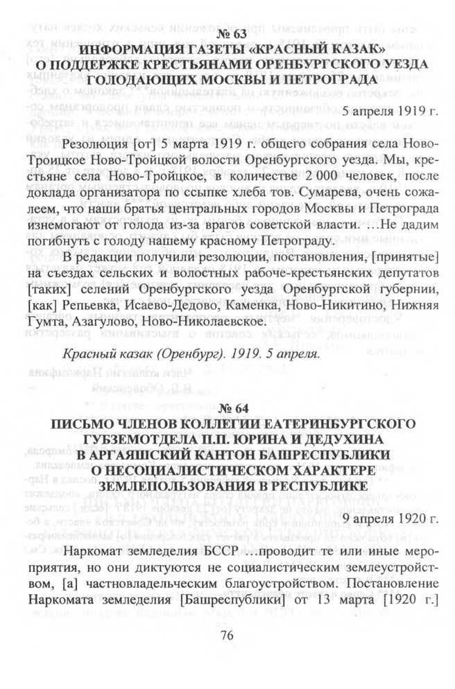Информация газеты «Красный казак» о поддержке крестьянами Оренбургского уезда голодающих Москвы и Петрограда. 5 апреля 1919 г. // Красный казак (Оренбург). 1919. 5 апреля.