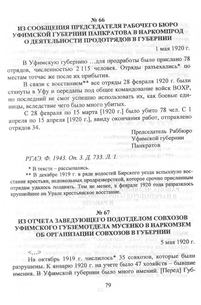 Из сообщения председателя рабочего бюро Уфимской губернии Панкратова в Наркомпрод о деятельности продотрядов в губернии. 1 мая 1920 г. // РГАЭ. Ф. 1943. Oп. 3. Д. 733. Л. 1.