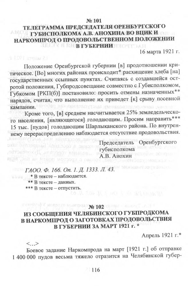 Телеграмма председателя Оренбургского губисполкома А.В. Анохина во ВЦИК и Наркомпрод о продовольственном положении в губернии. 16 марта 1921 г. // ГАОО. Ф. 166. Oп. 1. Д. 1333. Л. 43.