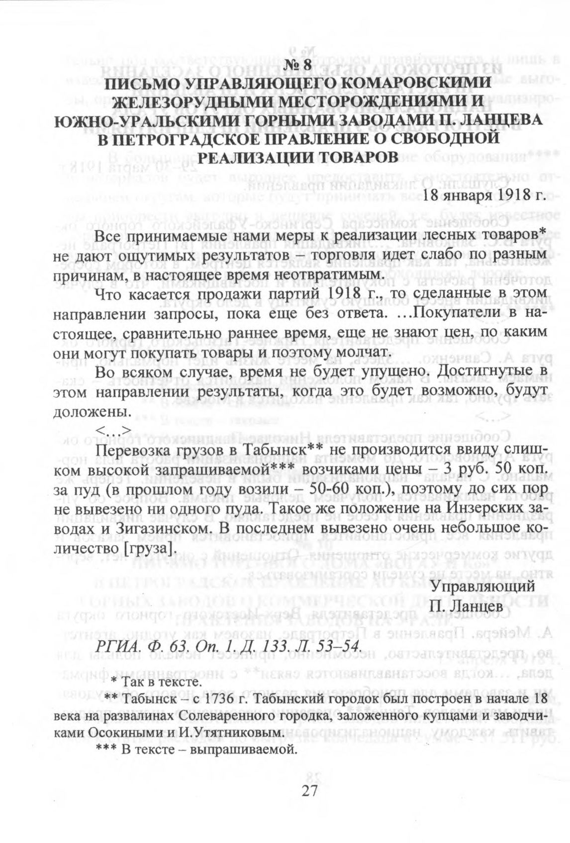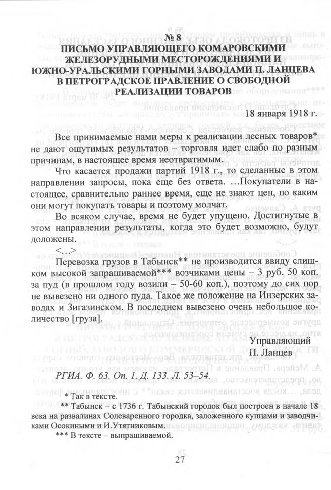 Письмо управляющего Комаровскими железорудными месторождениями и Южно-уральскими горными заводами П. Ланцева в Петроградское правление о свободной реализации товаров. 18 января 1918 г. // РГИА. Ф. 63. Oп. 1. Д. 133. Л. 53-54.