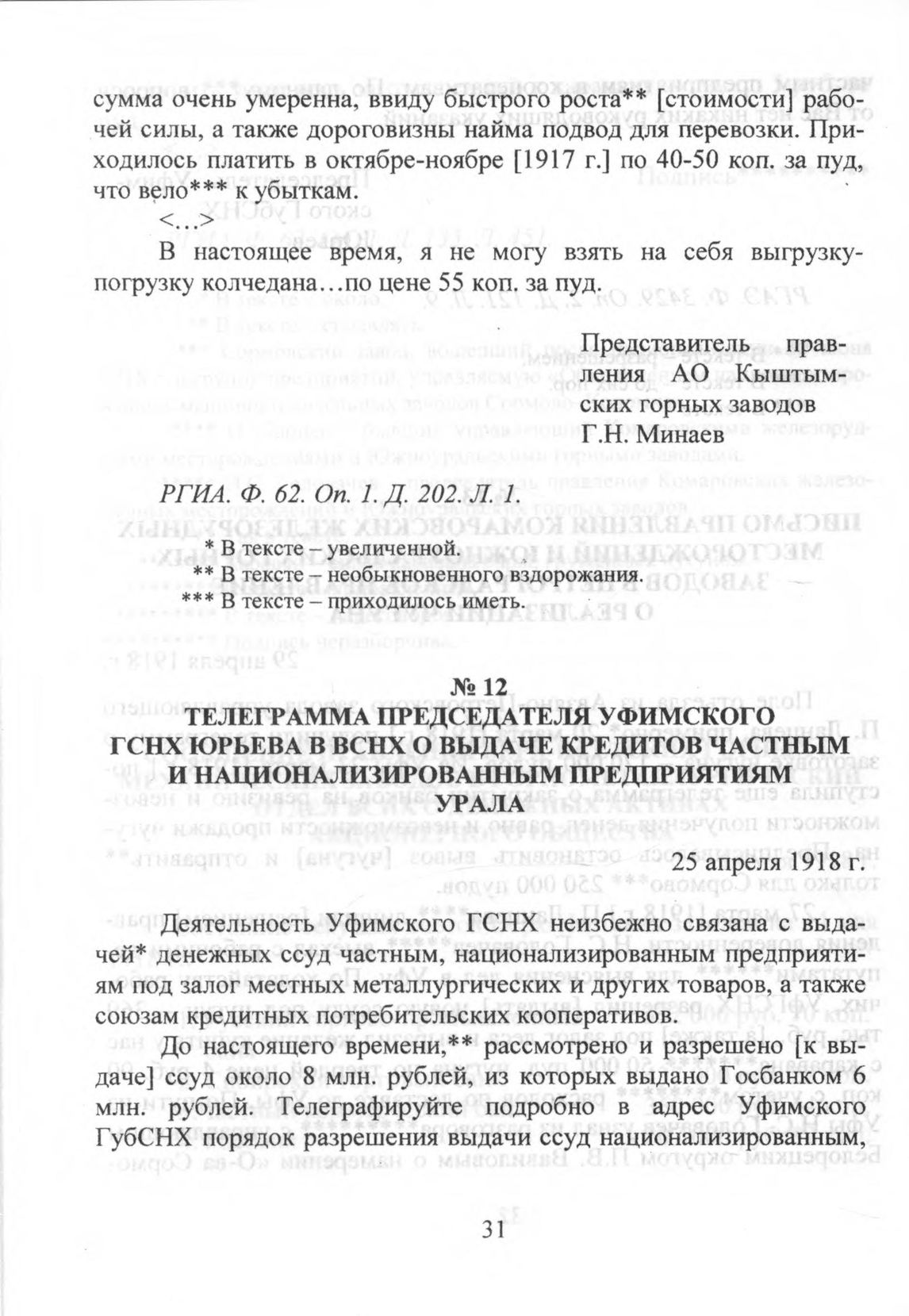 Телеграмма председателя Уфимского ГСНХ Юрьева в ВСНХ о выдаче кредитов частным и национализированным предприятиям Урала. 25 апреля 1918 г. // РГАЭ. Ф. 3429. Oп. 2. Д. 121. Л. 9.