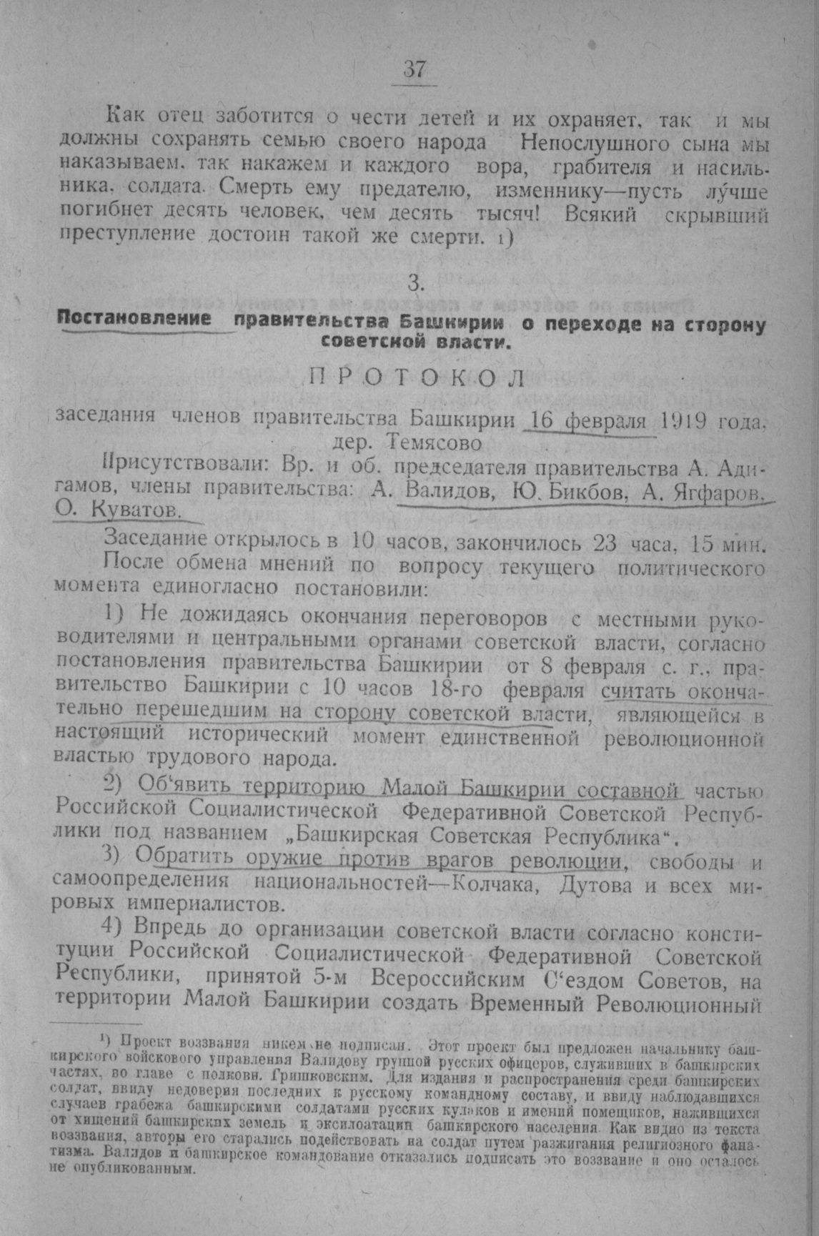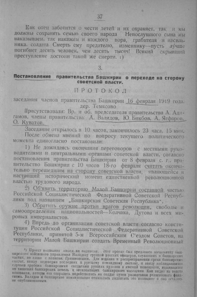 Постановление правительства Башкирии о переходе на сторону советской власти. 16 февраля 1919 г.
