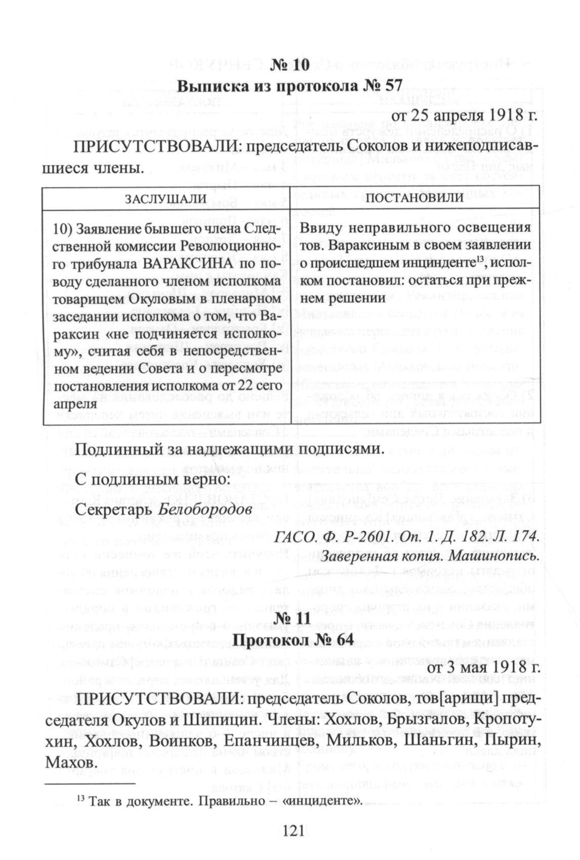 Выписка из протокола заседания Исполнительного Комитета Ирбитского уездного Совета рабочих, солдатских и крестьянских депутатов от 25 апреля 1918 г. // ГАСО. Ф. P-2601. Oп. 1.Д. 182. Л. 174. Заверенная копия. Машинопись.