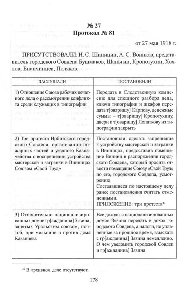 Протокол заседания Исполнительного Комитета Ирбитского уездного Совета рабочих, солдатских и крестьянских депутатов от 27 мая 1918 г. // ГА в г. Ирбите. Ф. P-194. Oп. 1. Д. 1. Л. 39. Заверенная копия. Машинопись.