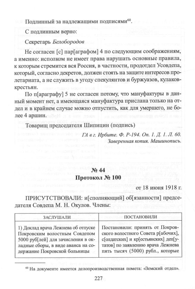 Протокол заседания Исполнительного Комитета Ирбитского уездного Совета рабочих, солдатских и крестьянских депутатов от 18 июня 1918 г. // ГА в г. Ирбите. Ф. P-194. Oп. 1. Д. 1. Л. 61. Заверенная копия. Машинопись.