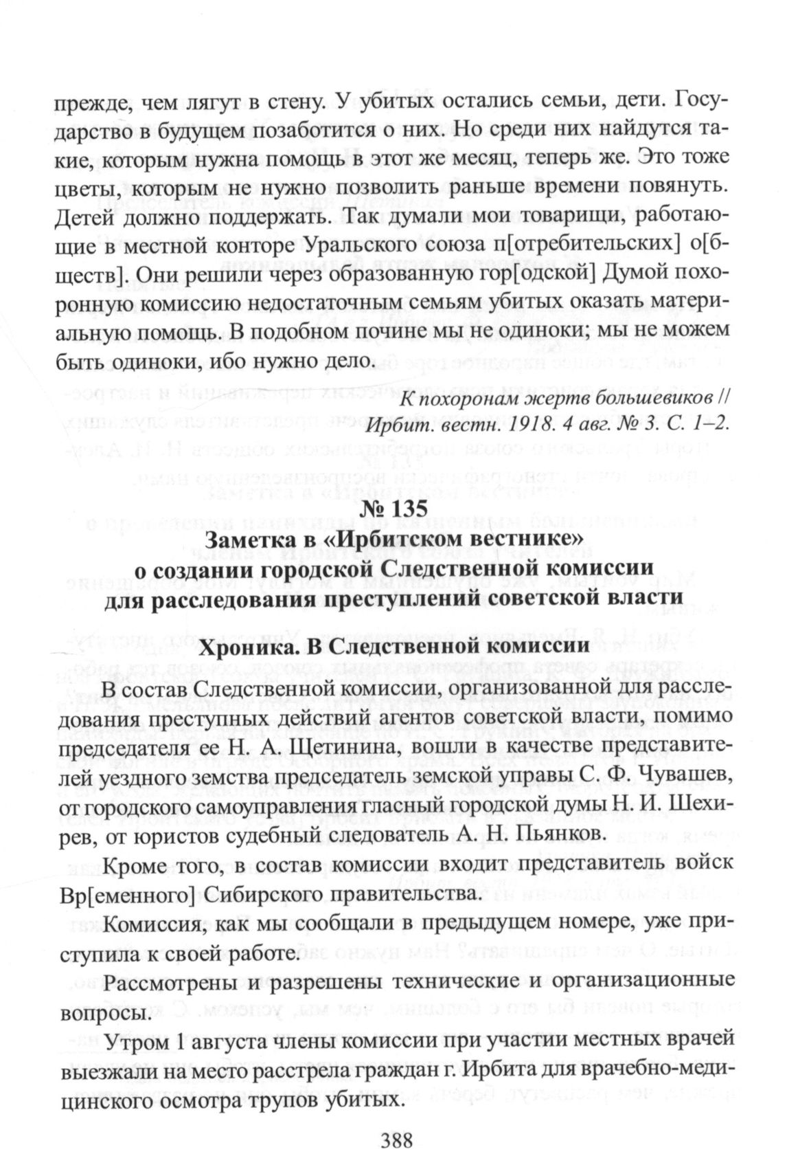 Заметка в «Ирбитском вестнике» о создании городской Следственной комиссии для расследования преступлений советской власти // Хроника. В Следственной комиссии // Ирбит. вестн. 1918. 4 авг. № 3. С. 3.