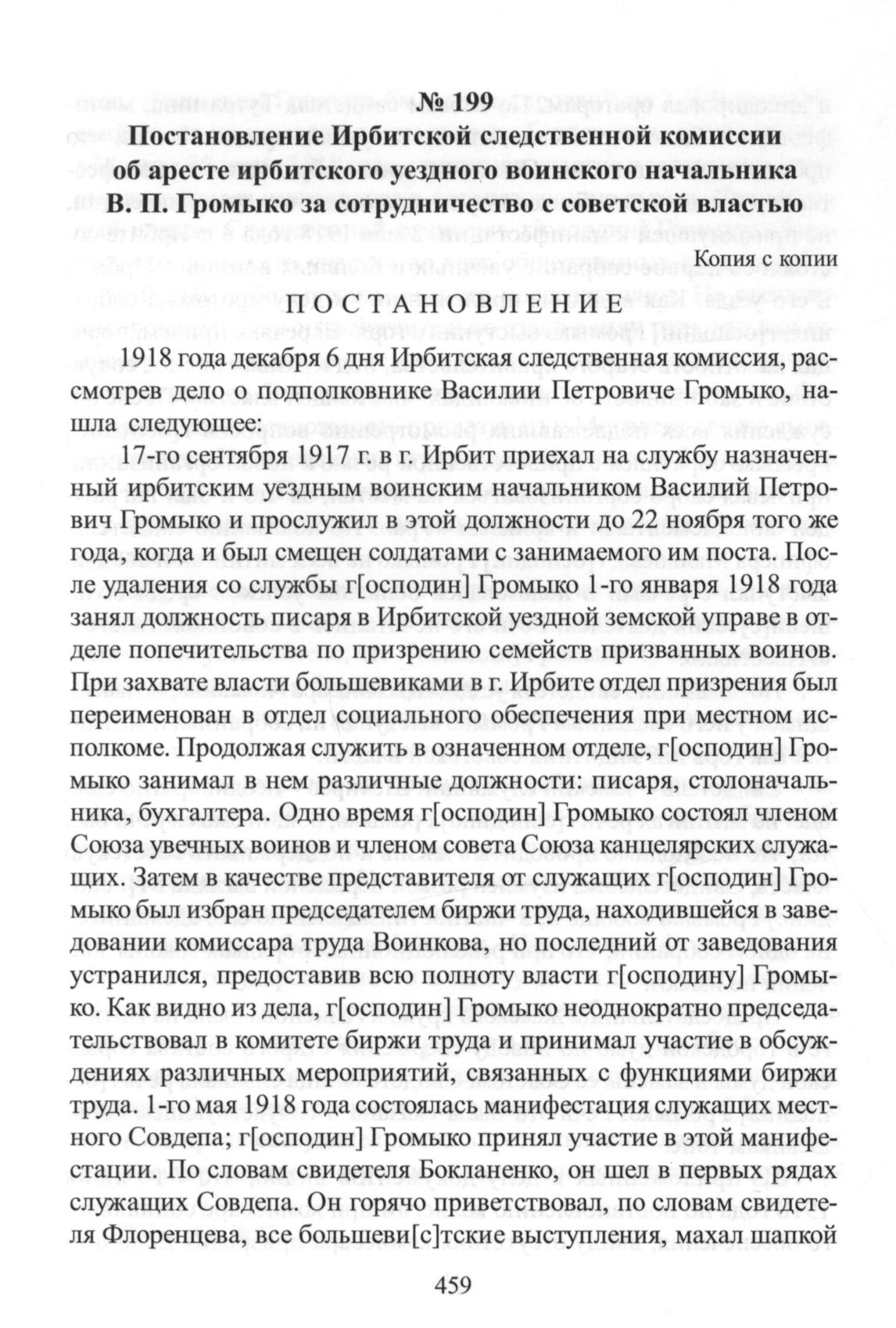 Постановление Ирбитской следственной комиссии об аресте ирбитского уездного воинского начальника В.П. Громыко за сотрудничество с советской властью. 9 декабря 1918 года // РГВА. Ф. 39610. Oп. 1. Д. 67. Л. 57-58. Заверенная копия. Машинопись.