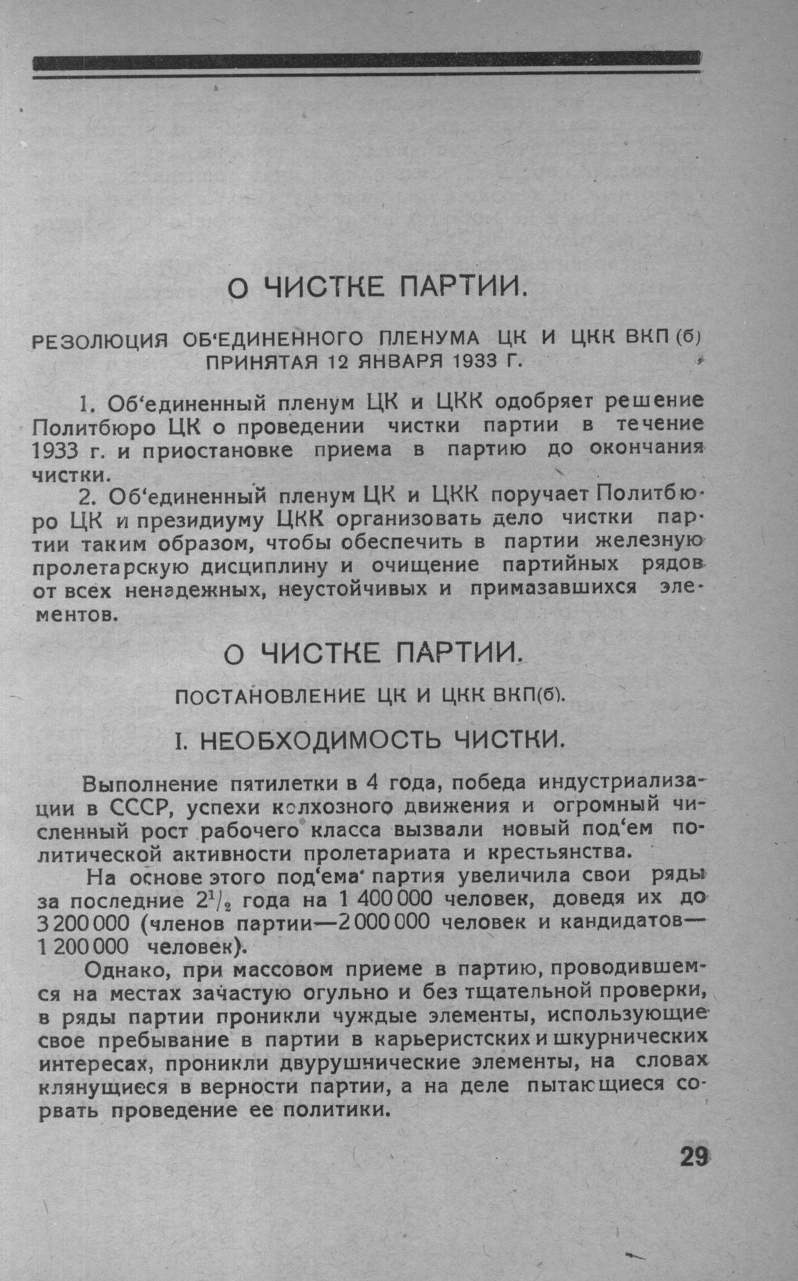 О чистке партии. Резолюция объединенного пленума ЦК и ЦКК ВКП(б), принятая 12 января 1933 г.
