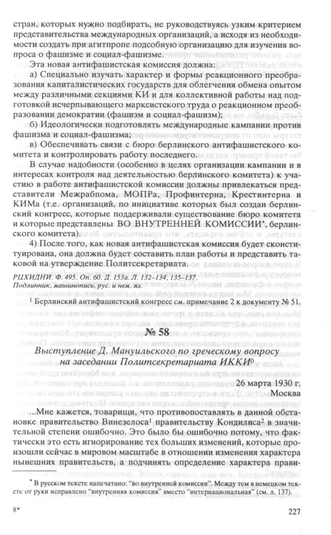 Выступление Д. Мануильского по греческому вопросу на заседании Политсекретариата ИККИ. 26 марта 1930 г. Москва // РЦХИДНИ. Ф. 495. Оп. 3. Д. 210. Л. 17. 17об„ 18. Подлинник, машинопись, рус. яз.